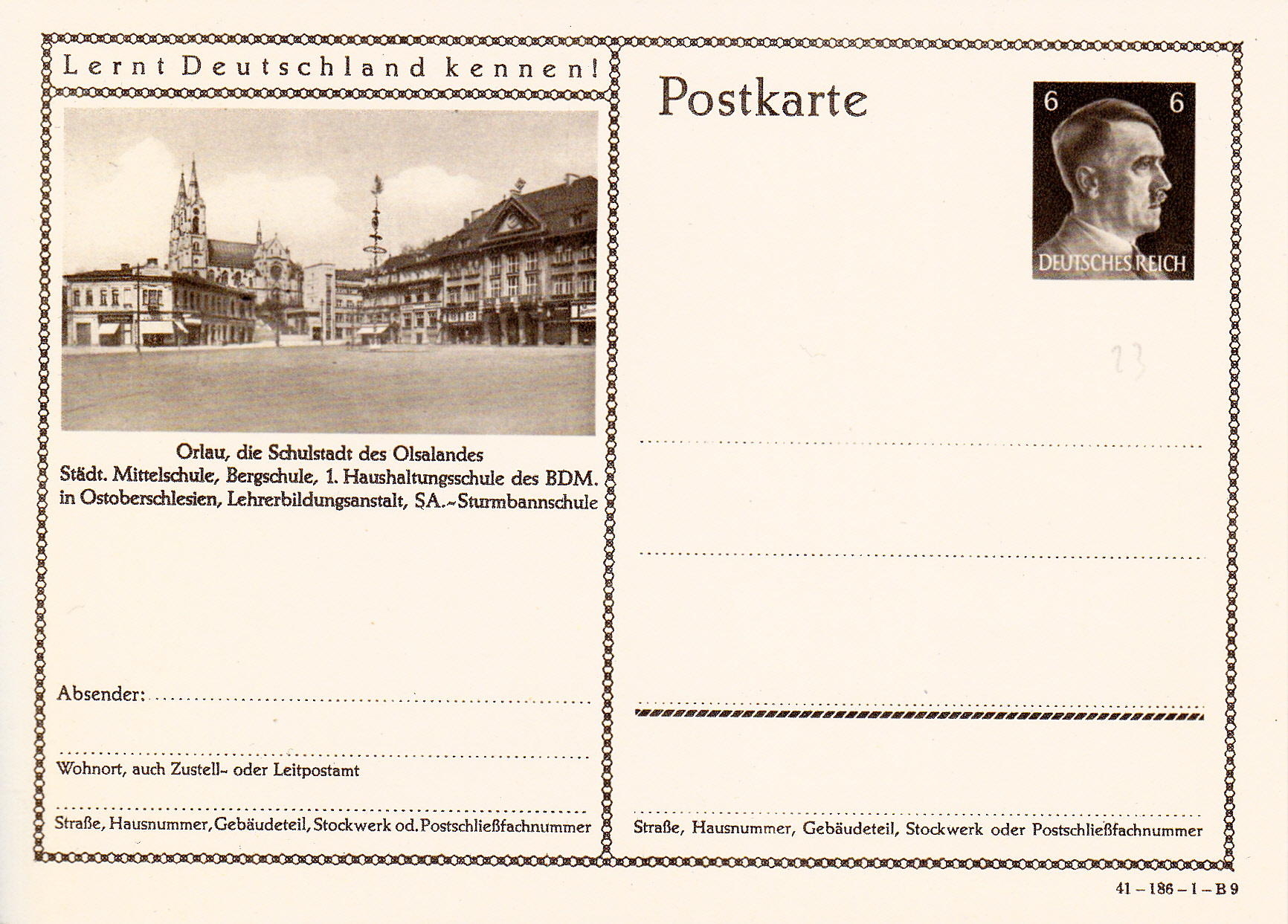 Orlau wirbt auf dieser Karte (Serie 186 Bild 9) als Schulstadt und zeigt seinen Marktplatz. Orlau heißt heute Orlová und ist eine Stadt im Okres Karviná in Tschechien.