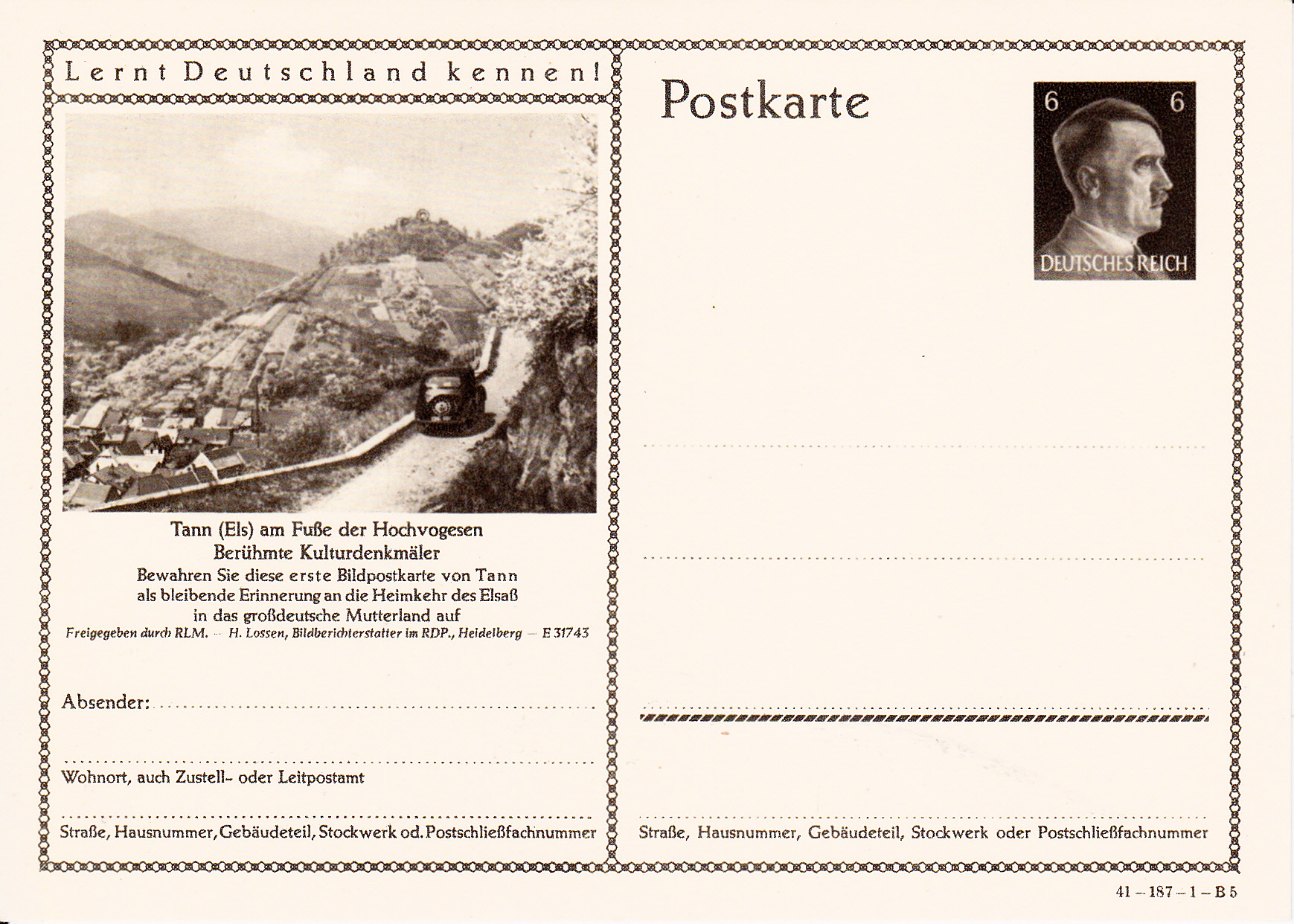 Auf dieser Karte (Serie 187 Bild 3) sehen wir eine Ansicht aus Tann im Elsass. Tann schreibt sich heute wieder Thann und ist wieder eine französische Stadt im Département Haut-Rhin.