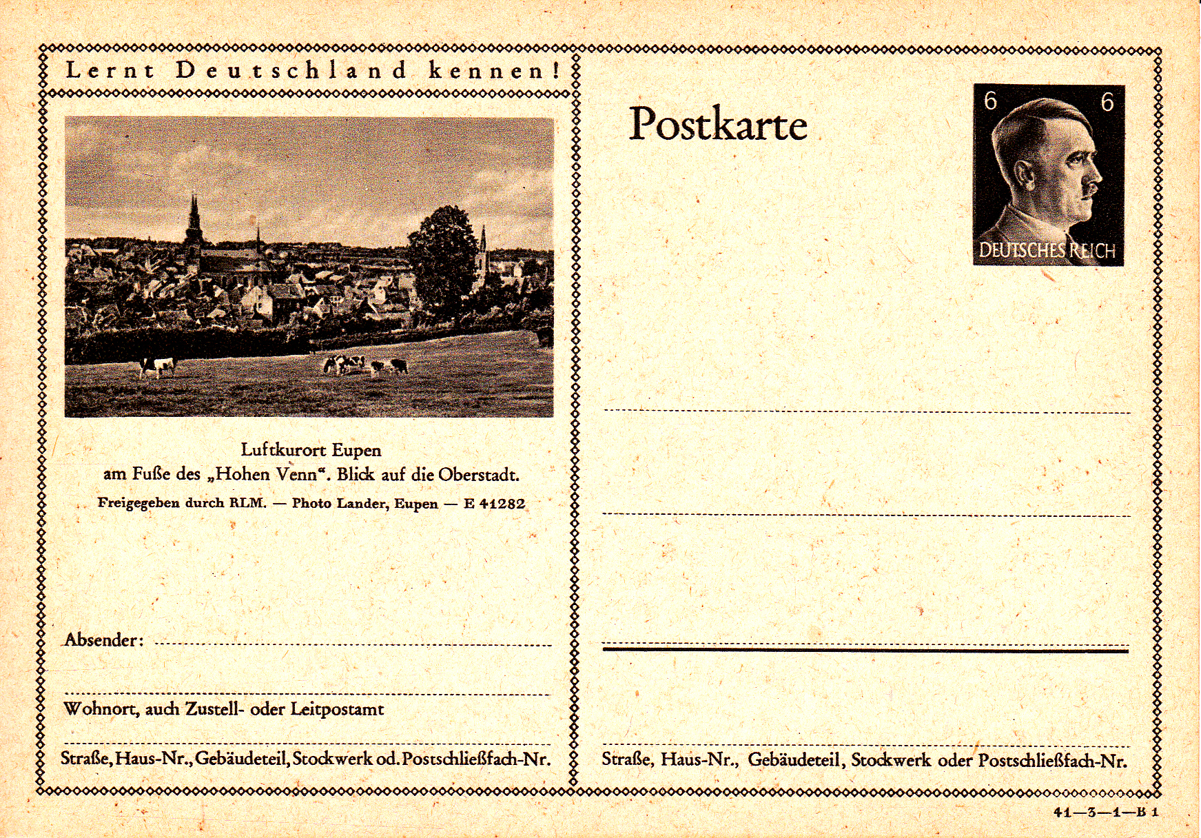 Eupen wirbt auf dieser Bildpostkarte (Serie 3 Bild 1) als Luftkurort mit einem Blick auf den Kurort. Eupen war ab 18.Mai 1940 bis Kriegsende dem Deutschen "angegliedert" worden.