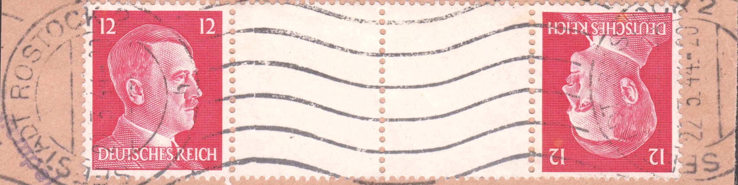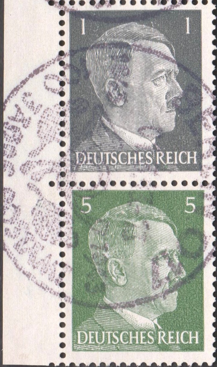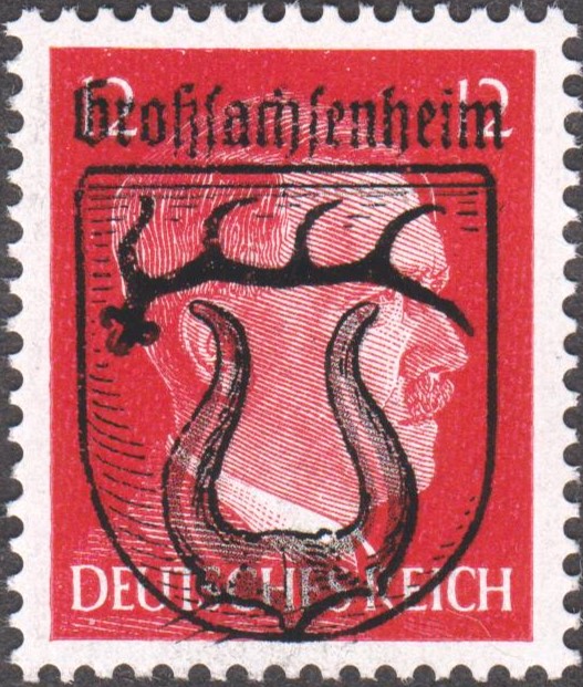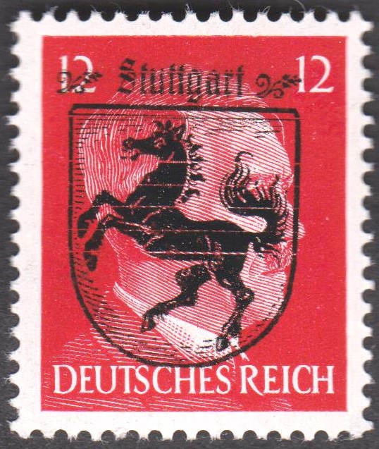 Hier als weiteres Beispiel zwei Postwertzeichen 8 Pf sowie 12 Pf Dauerserie Adolf Hitler mit Aufdruck "STUTTGART" sowie dem Stadtwappen: