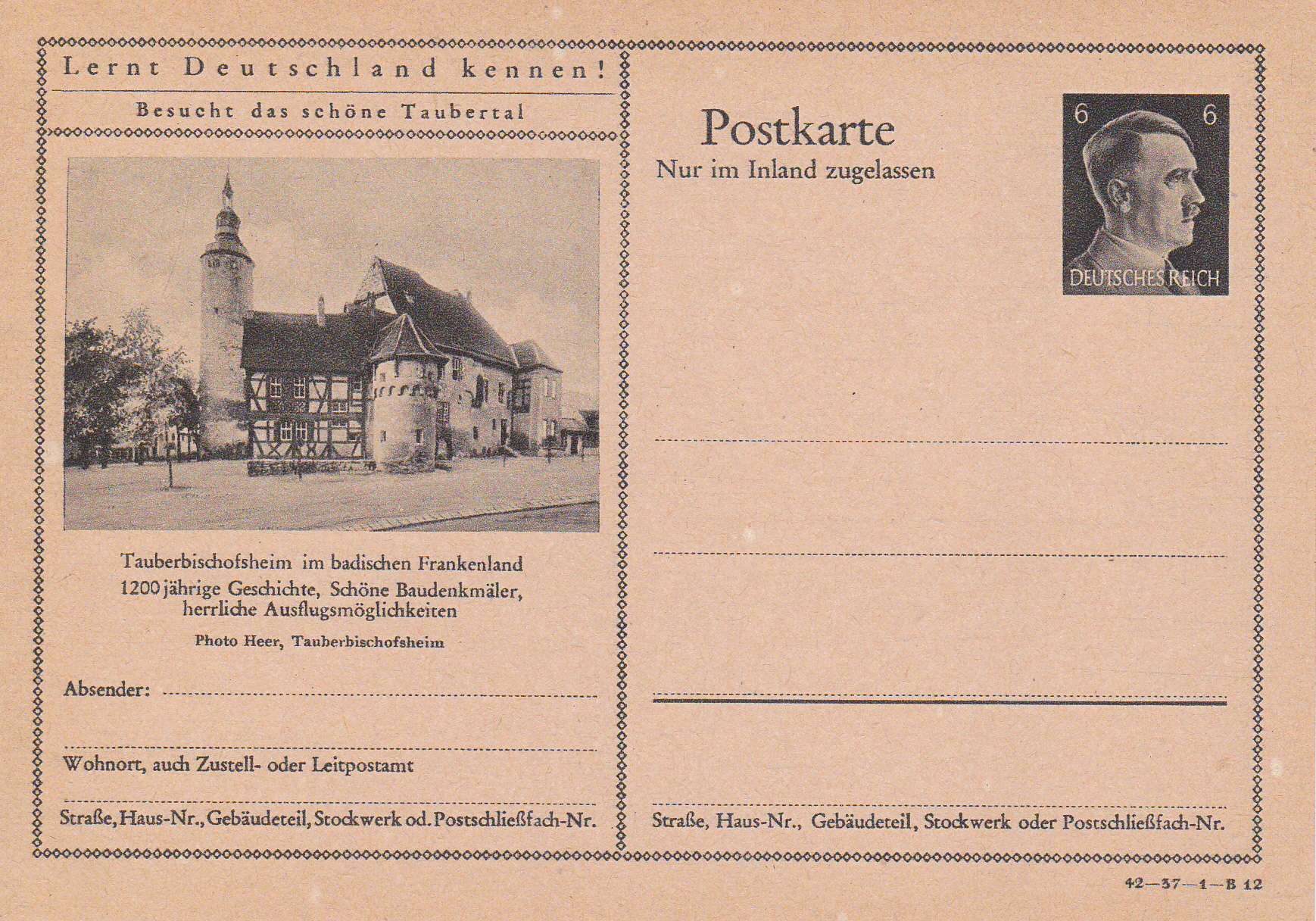 Tauberbischofsheim zeugt auf dieser Bildpostkarte (Serie 37 Bild 10) das Kurmainzische Schloss Tauberbischofsheim mit Türmersturm (auch Schloss Tauberbischofsheim, ehemalige Burg bzw. Stadtburg in Bischofsheim).