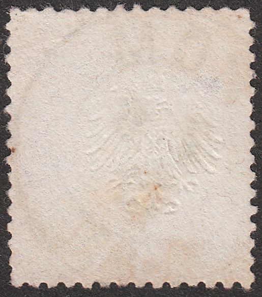 Diese MiNr. 5 XII zeigt den Plattenfehler "Gebrochenes C in REICHS-" und wurde entwertet per nachverwendetem preussischem Zweikreisstempel CÖLN BAHNHOF mit feststehender Uhrzeit "8-9 V.", Feuser Pr 609: