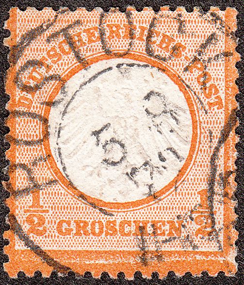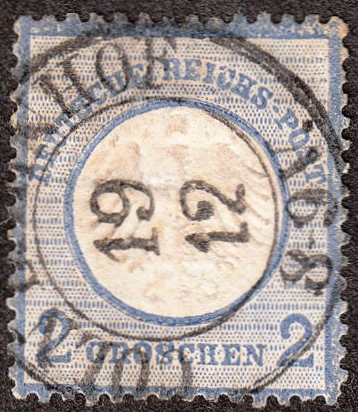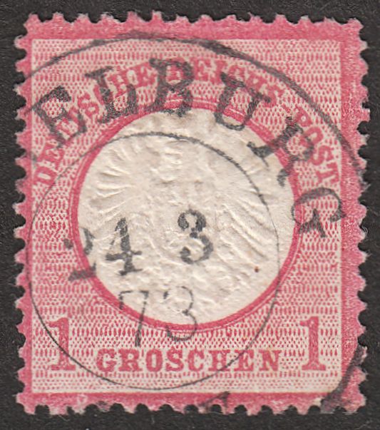 Diese am 26.08.1874 per nachverwendetem sächsischem Zweikreisstempel "RONNEBURG" entwertete MiNr. 19 XXIII a zeigt den Plattenfehler "Akzent über "C" in "REICHS-" auf der 1. Strichelleiste":