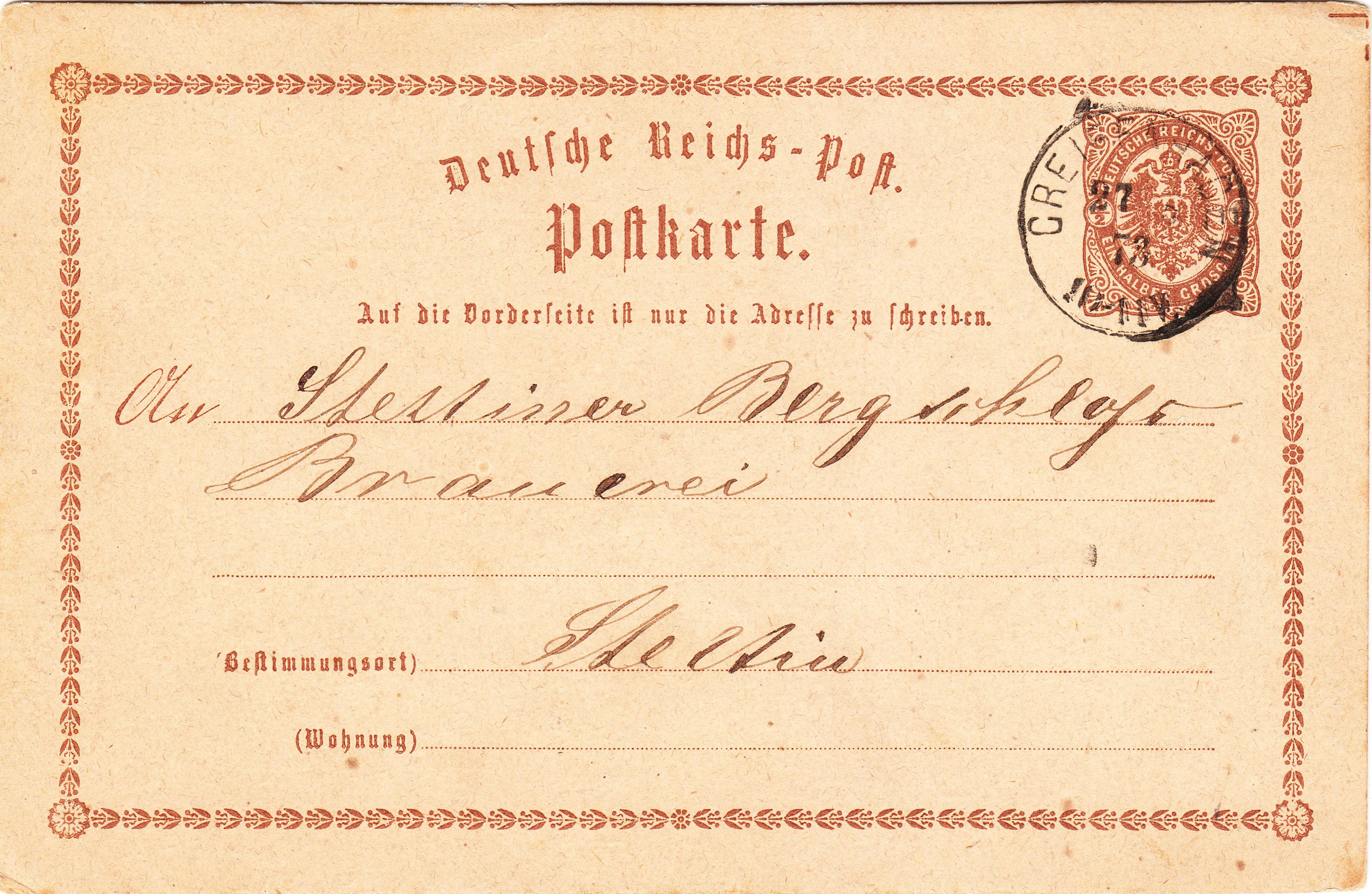Diese Ganzsache MiNr. P 1 wurde am 27.05.1873 entwertet per nachverwendetem preussischem Kreisstempel GREIFENHAGEN: