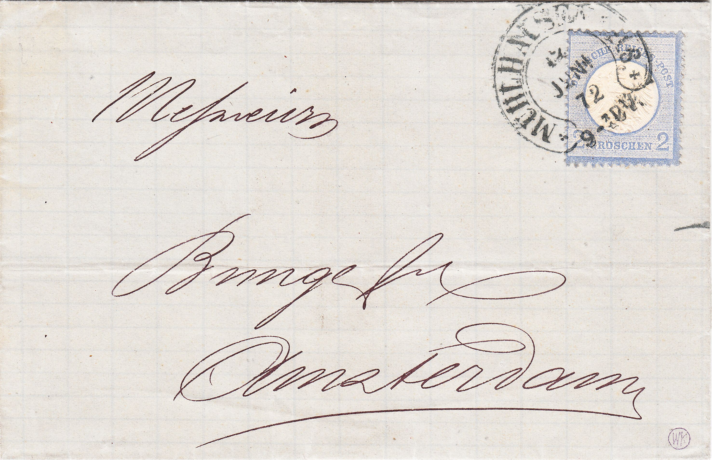 Hier eine MiNr. 5 am 12.06.1872 als EF auf Brief von Mühlhausen nach Amsterdam: