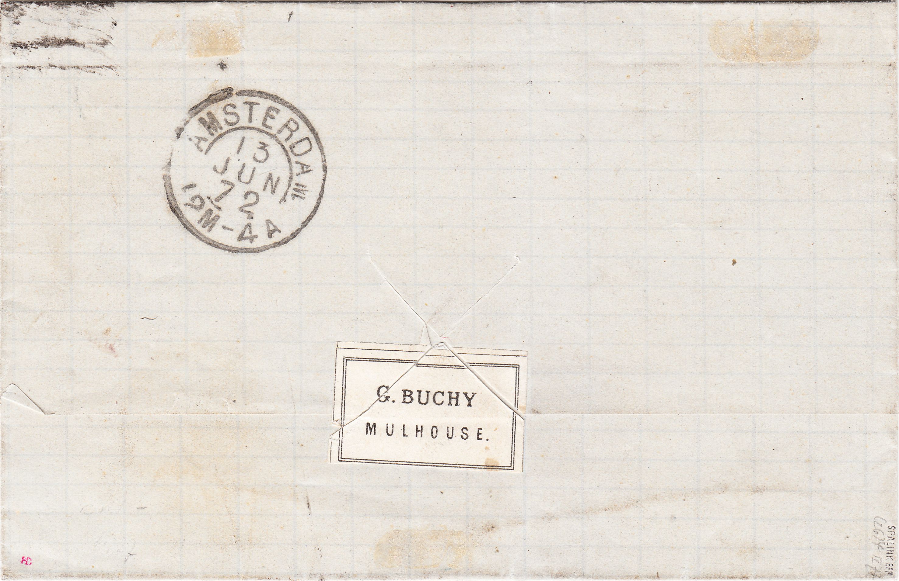 Rückseitig findet sich ein Zweikreisstempel aus AMSTERDAM vom 13.06.1872 als Ankunftstempel: