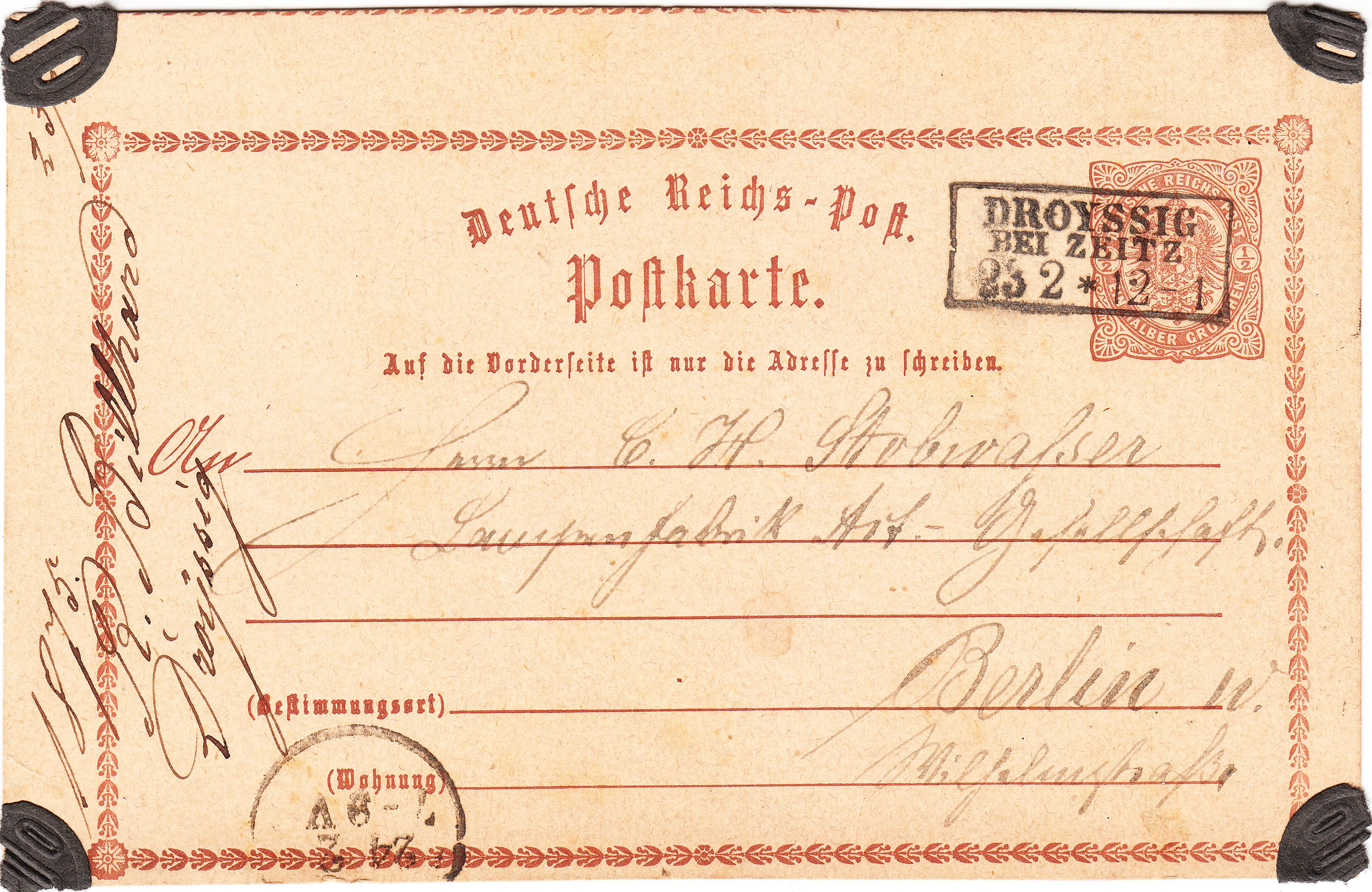https://www.ebay.de/itm/DR0YSSIG-bei-ZE ... 2749.l2649Bei dem Stempel vom 23.02.1875 handelt es sich übrigens um einen nachverwendeten preussischen dreizeiligen Rechteckstempel "DROYSSIG BEI ZEITZ *", katalogisiert als Feuser Pr 824.
