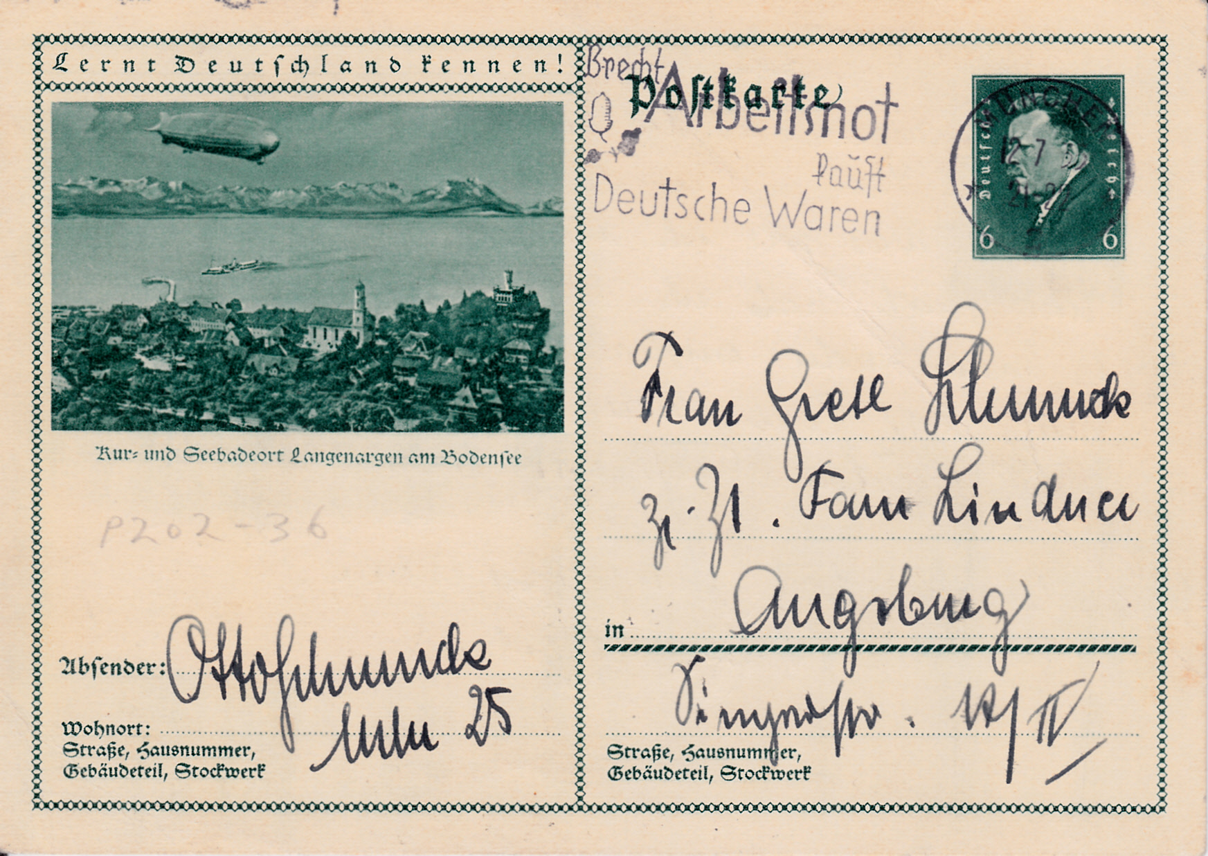 Einen Blick von oben auf Langenargen am Bodensee sehen wir auf dieser Bildpostkarte (MiNr P 202/36).