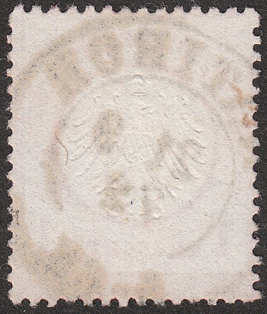 Dieses Exemplar trägt einen nachverwendeten preußischen Zweikreisstempel "BERLIN P.E.No 12." mit der auf eine halbe Stunde genauen Zeitangabe "8 1/2-9N.". Nach so langer Einsatzzeit wundert es einen nicht, dass dieser Handstempel in Innenkreis unter dem "P." eine Delle aufweist und dass zwischen Jahreszahl und Zeitangabe sogar ein Stück des Innenkreisess fehlt.