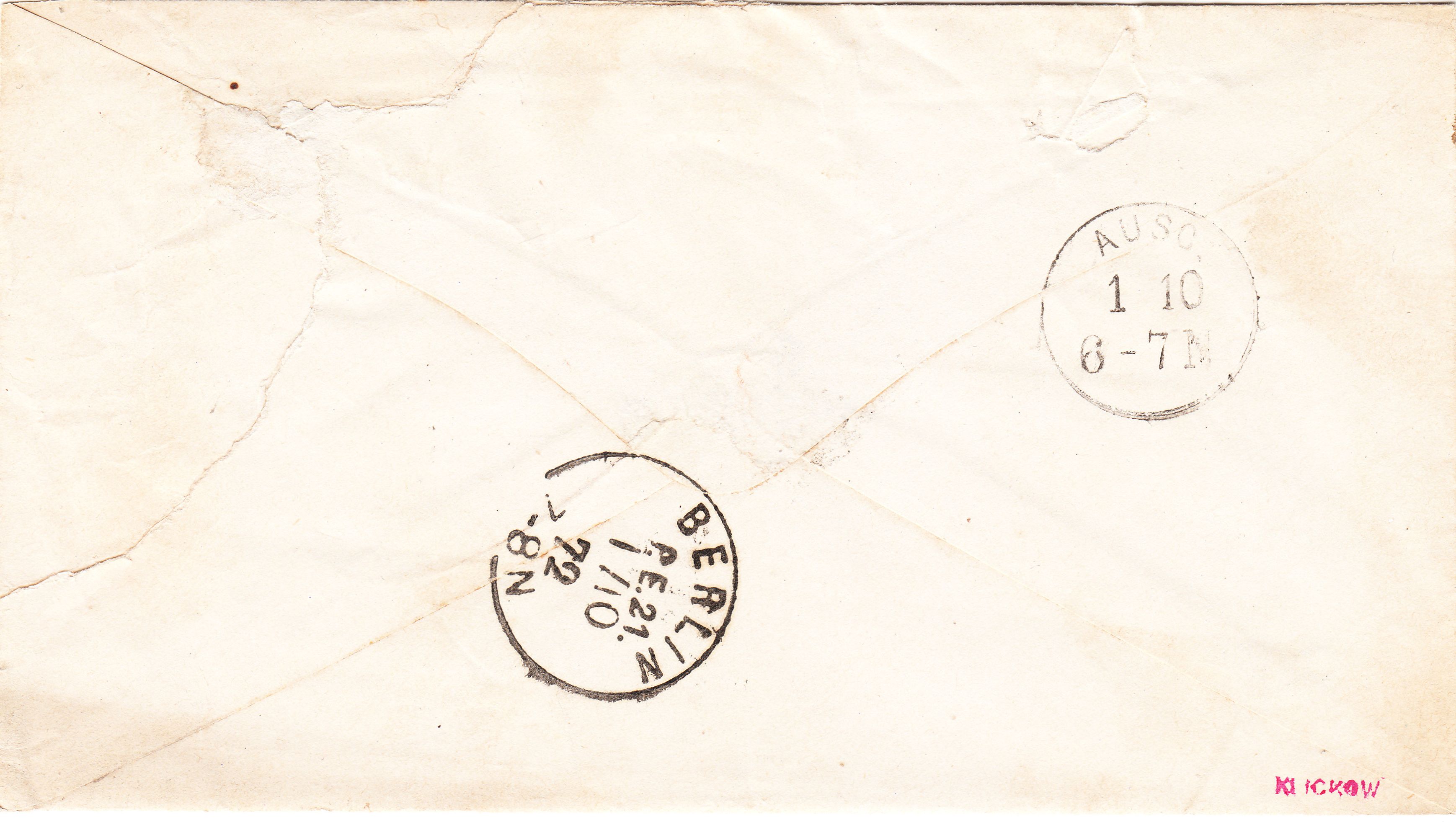 Rückseitig findet sich ein Kreisstempel "BERLIN P.E.21" vom 01.10.1872 "7-8N" sowie ein Kreisstempel "AUSG. 1 10 6 - 7 N".
