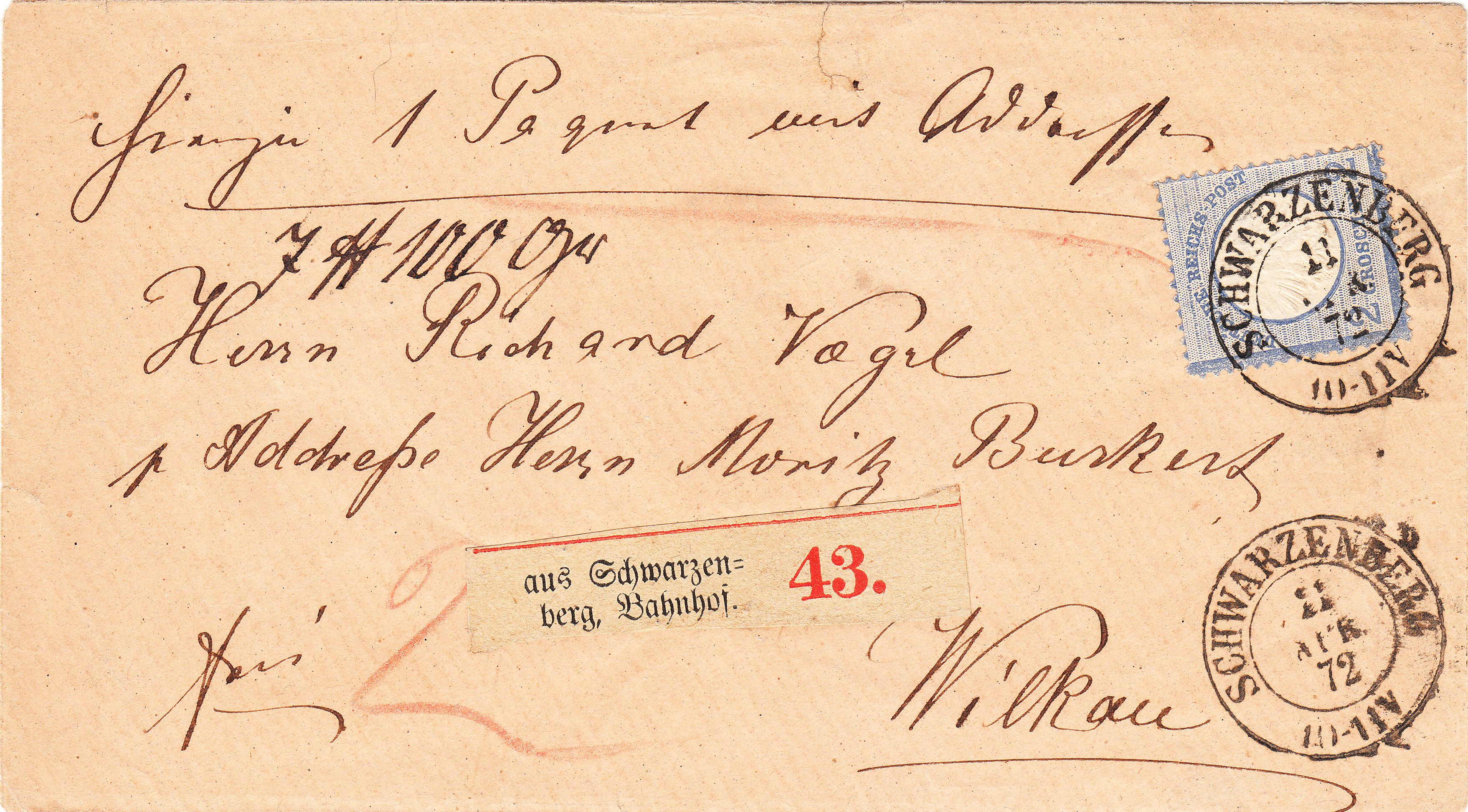 Nach rechts oben dezentrierte MiNr. 5 als EF auf Paketbegleitbrief, aufgegeben am 11.04.1872 in SCHWARZENBERG, entwertet per nachverwendetem sächsischem Zweikreisstempel: