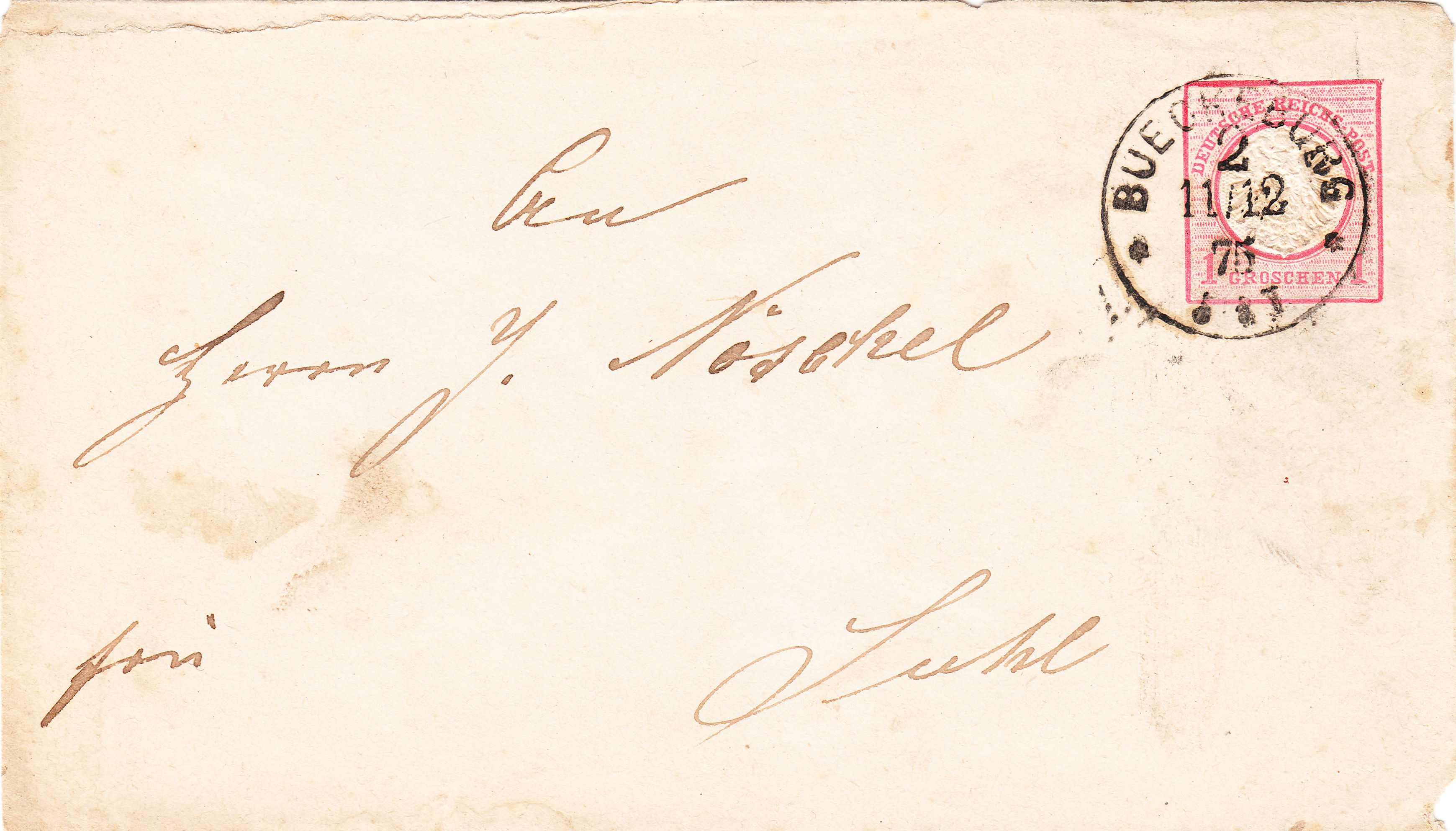 Beim Großtauschtag am vergangenen Sonntag in Kevelaer erhielt ich für 5 € diese Ganzsache U 3 I A mit Kreisstempel "BUECKEBURG 2" vom 11.12.1875, also als extreme Spätverwendung in der Zeit der Pfennigwährung: