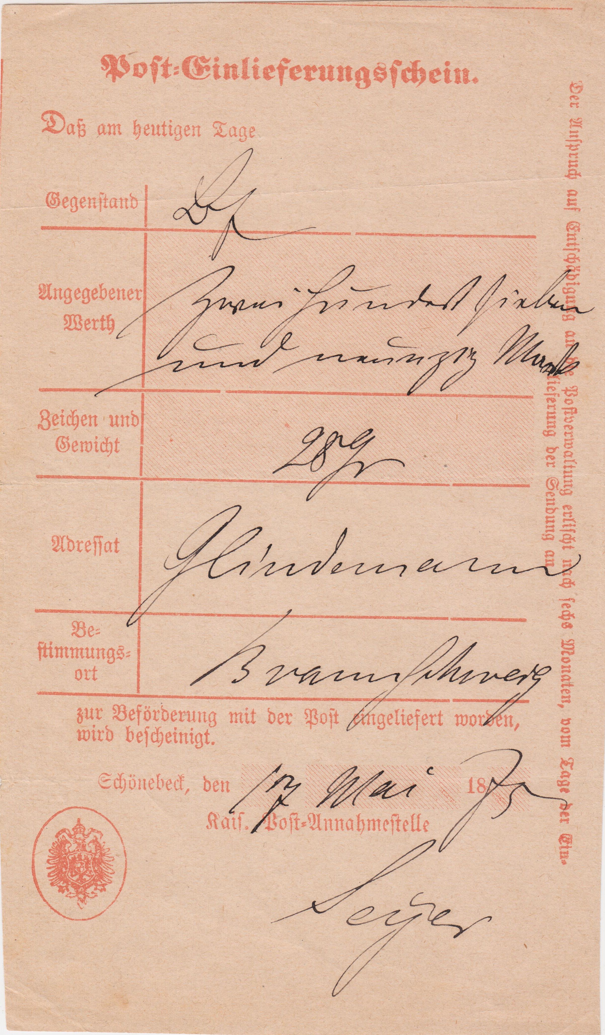 Post-Einlieferungsschein als Vordruck aus "Schönebeck" mit Eindruck des Jahrhunderts "18" sowie einem Reichsadler mit grossem Brustschild, also aus der Zeit des Deutschen Reiches stammend, verwendet am 17.05.1875 bei der Einlieferung eines Briefes mit Wertangabe in "Mark":