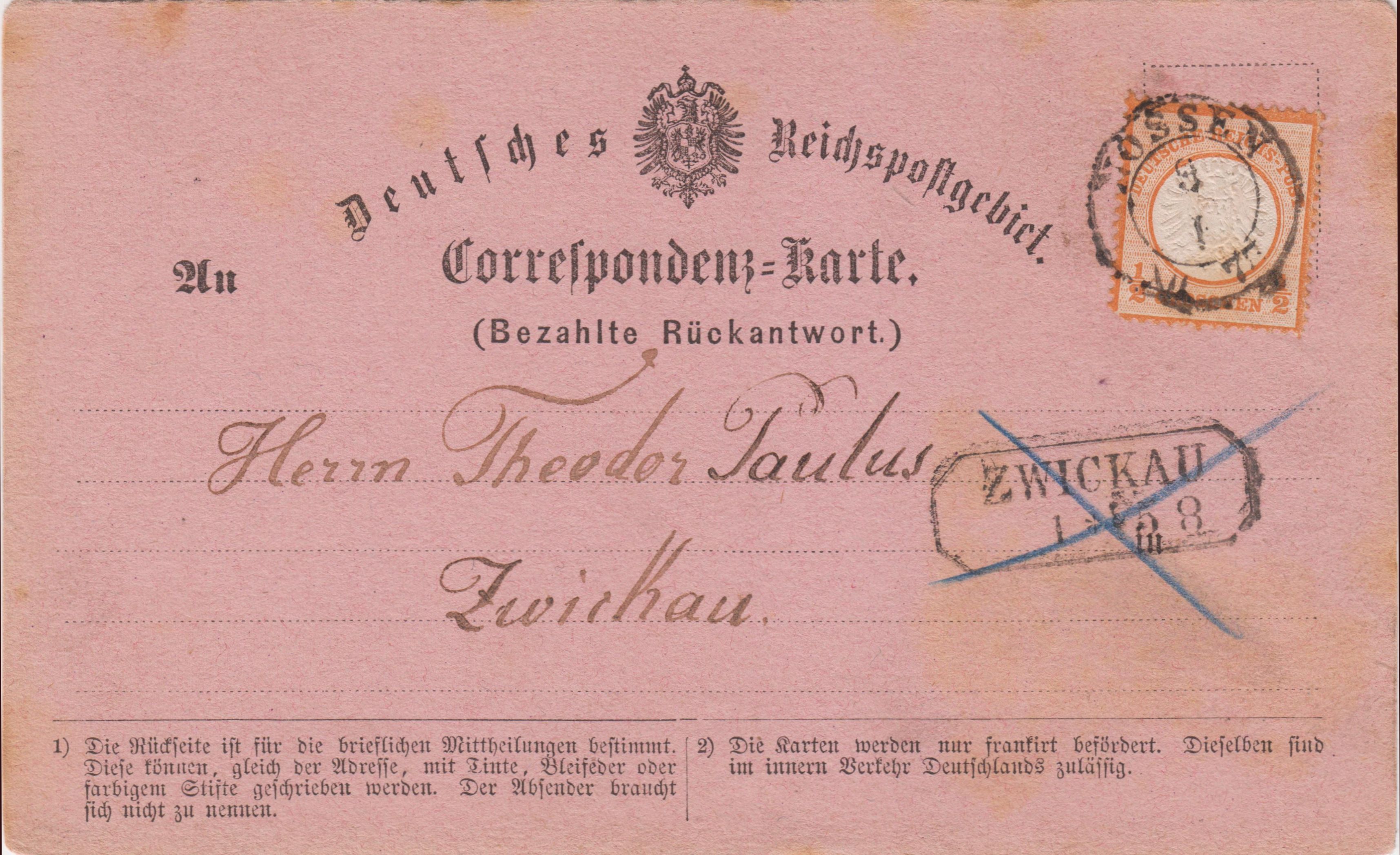 EF der MiNr. 18, leider unten links mit Zahnfehler, am 09.01.1875, also im ersten Monat der Weiterverwendungszeit der Brustschildmarken zur Zeit der Markwährung 1875, auf einem Vordruck "Deutsches Reichspostgebiet. Correspondenz=Karte. (Bezahlte Rückantwort.)" mit achteckigem Stempel ZWICKAU als Ankunftsstempel, bei dem die Stundenangabe "8" eindeutig auf dem Kopf steht: