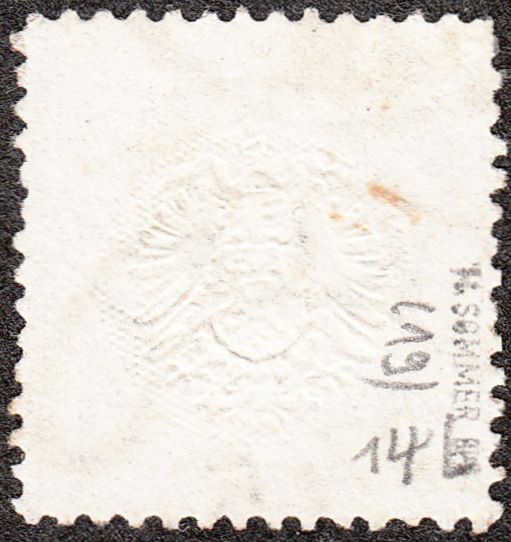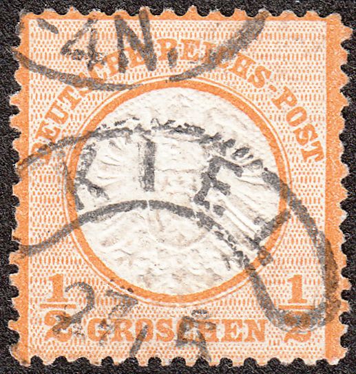 Es handelt sich um eine EF der MiNr. 33 a, die einen Reichsadler mit grossem Brustschild im Oval zeigt, entwertet per Kreisstempel SUHL am 04.12.1875, also noch zur Zeit der Gültigkeit der Brustschildmarken.