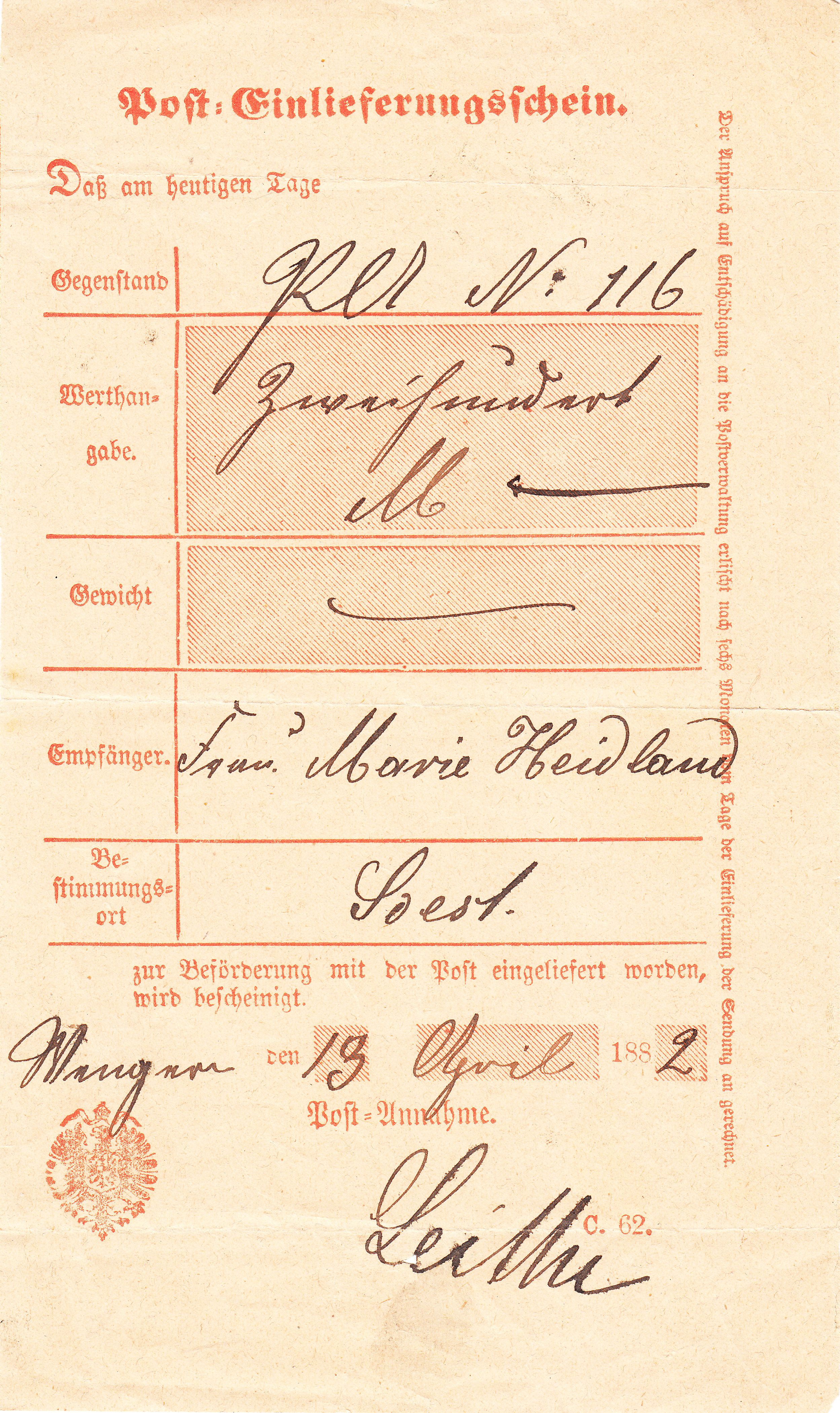 Dieser Vordruck "Post-Eiinlieferungsschein." mit vorgedrucktem Jahrzehnt "188 " wurde am 13.04.1882 in "Wengern" benutzt, um die Einlieferung einer "PA" = Postanweisung mit Wertangabe "200 M." = Mark zu dokumentieren: