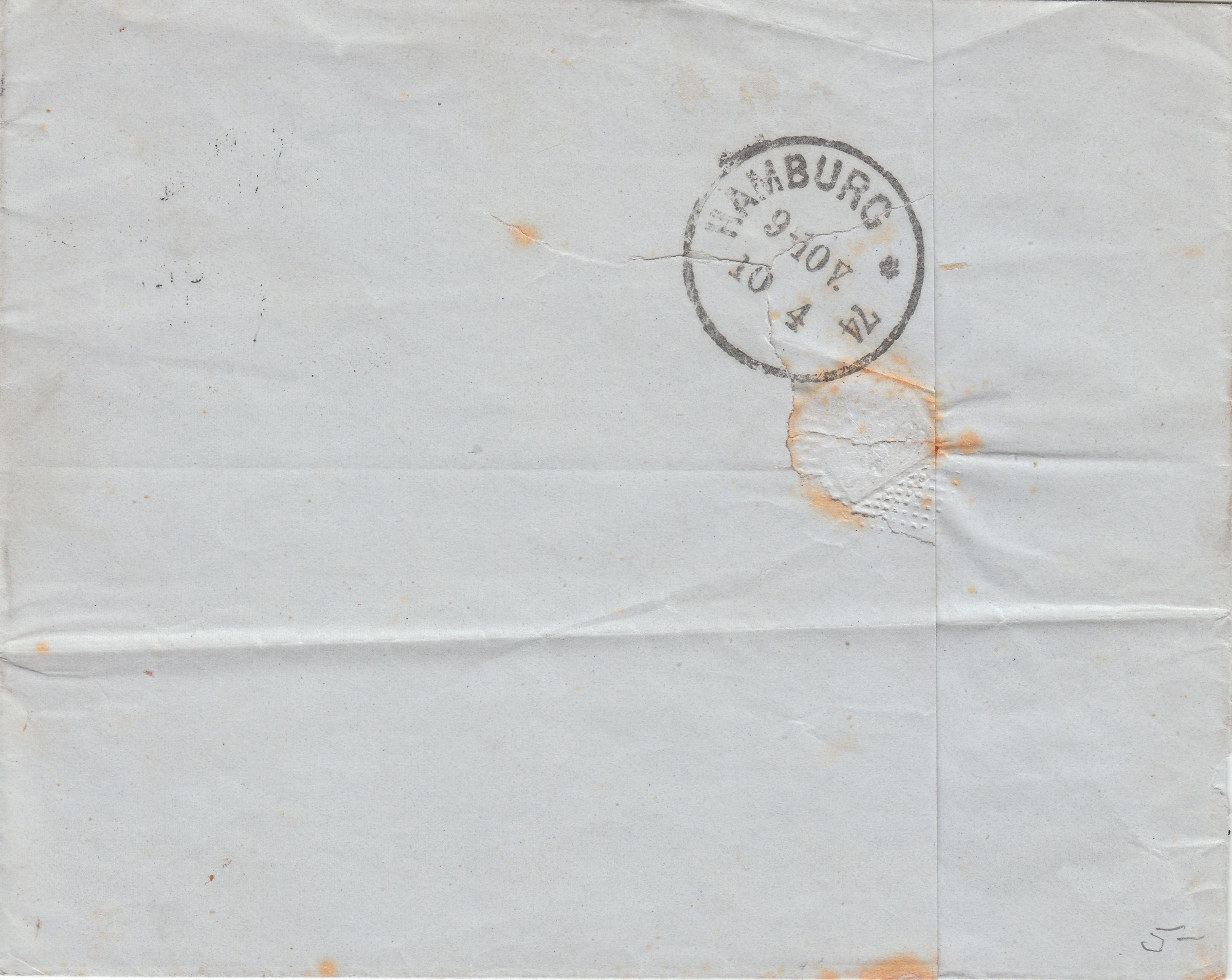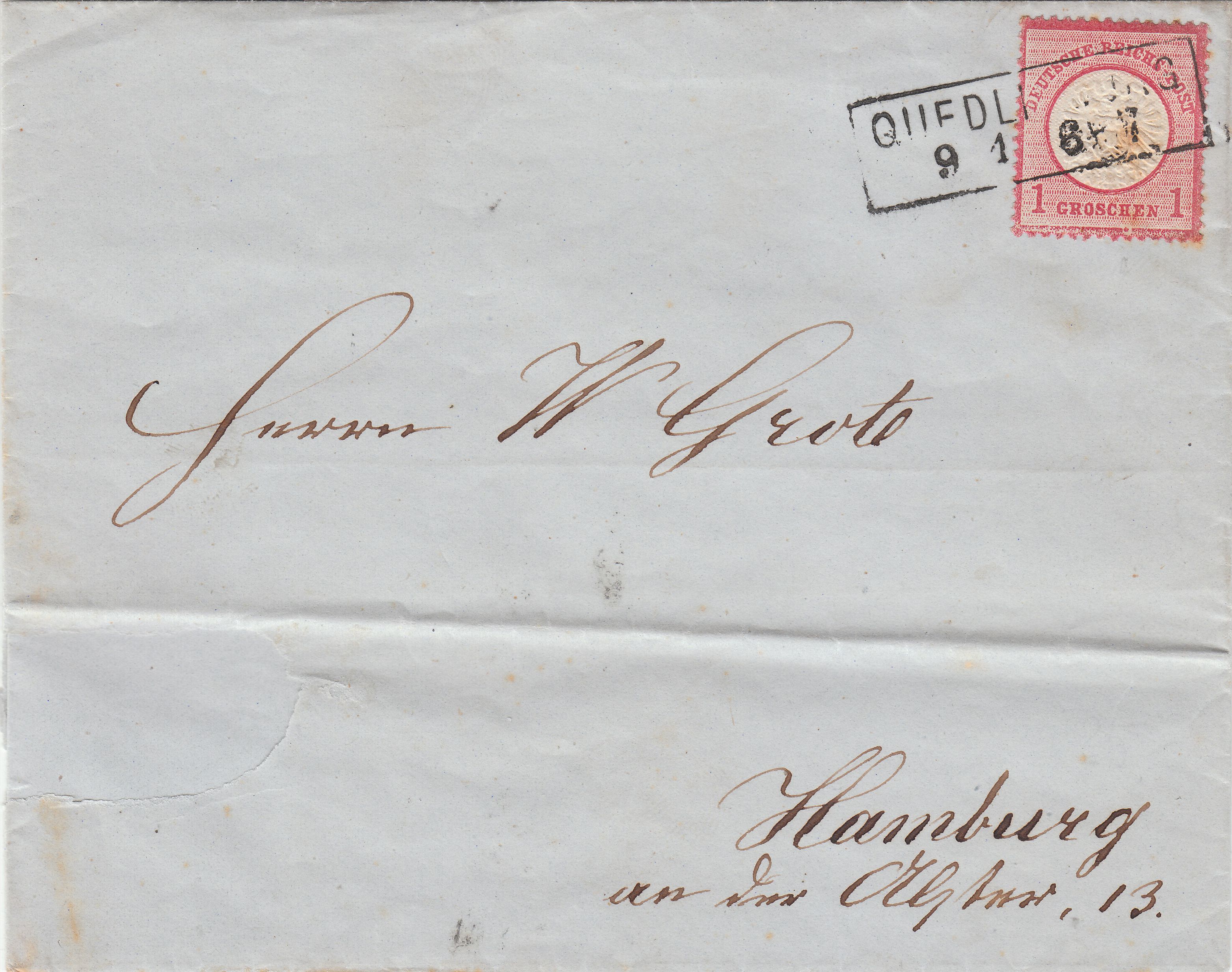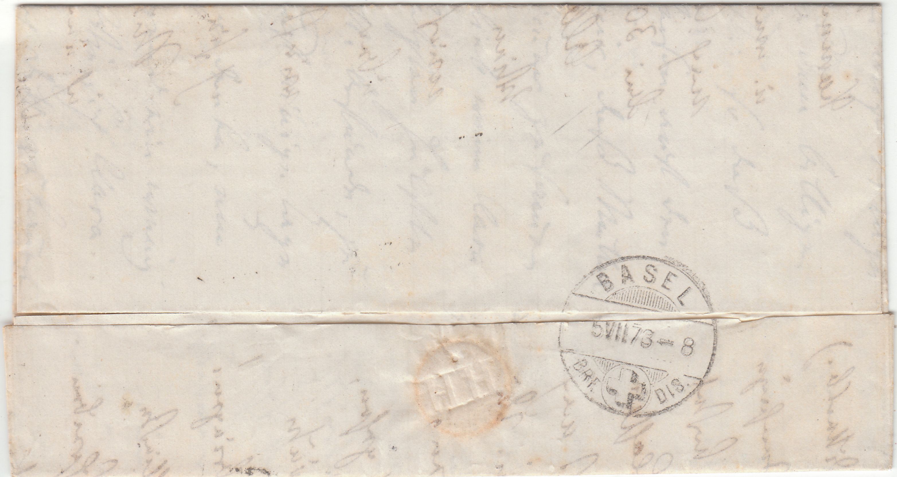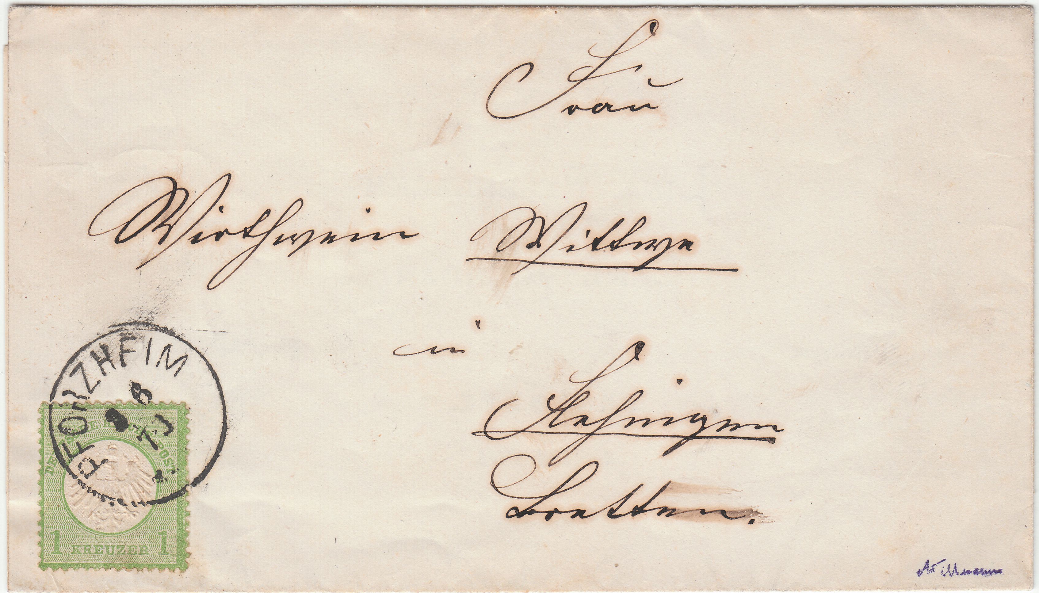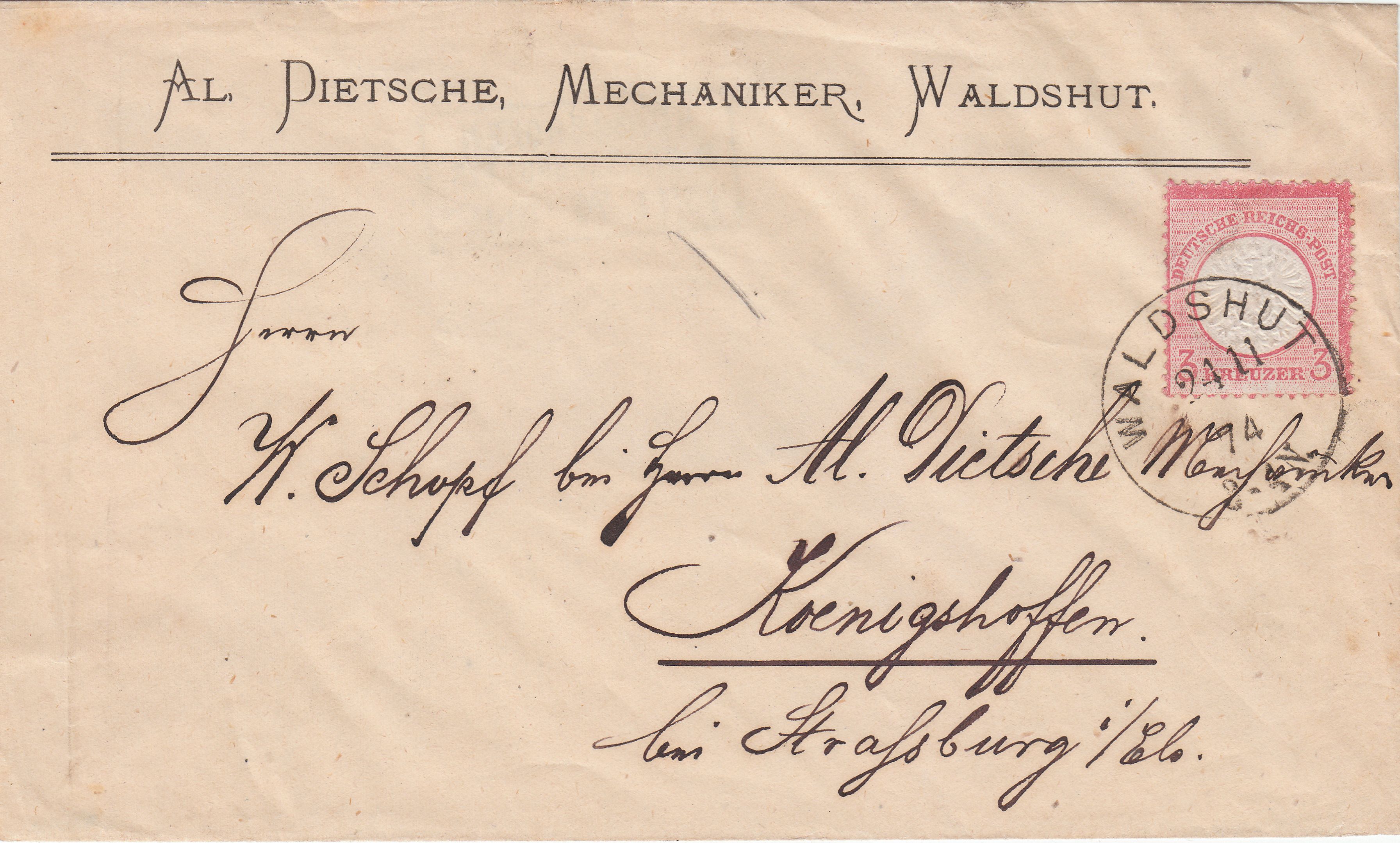 Weiter geht es heute mit einer MiNr. 25 als EF am 24.11.1874 verwendet ab WALDSHUT, adressiert nach Königshofen bei Straßburg im Elsaß, wo rückseitig am 25.11.1874 ein dreizeiliger Rechteckstempel als Ankunftsstempel abgeschlagen wurde: