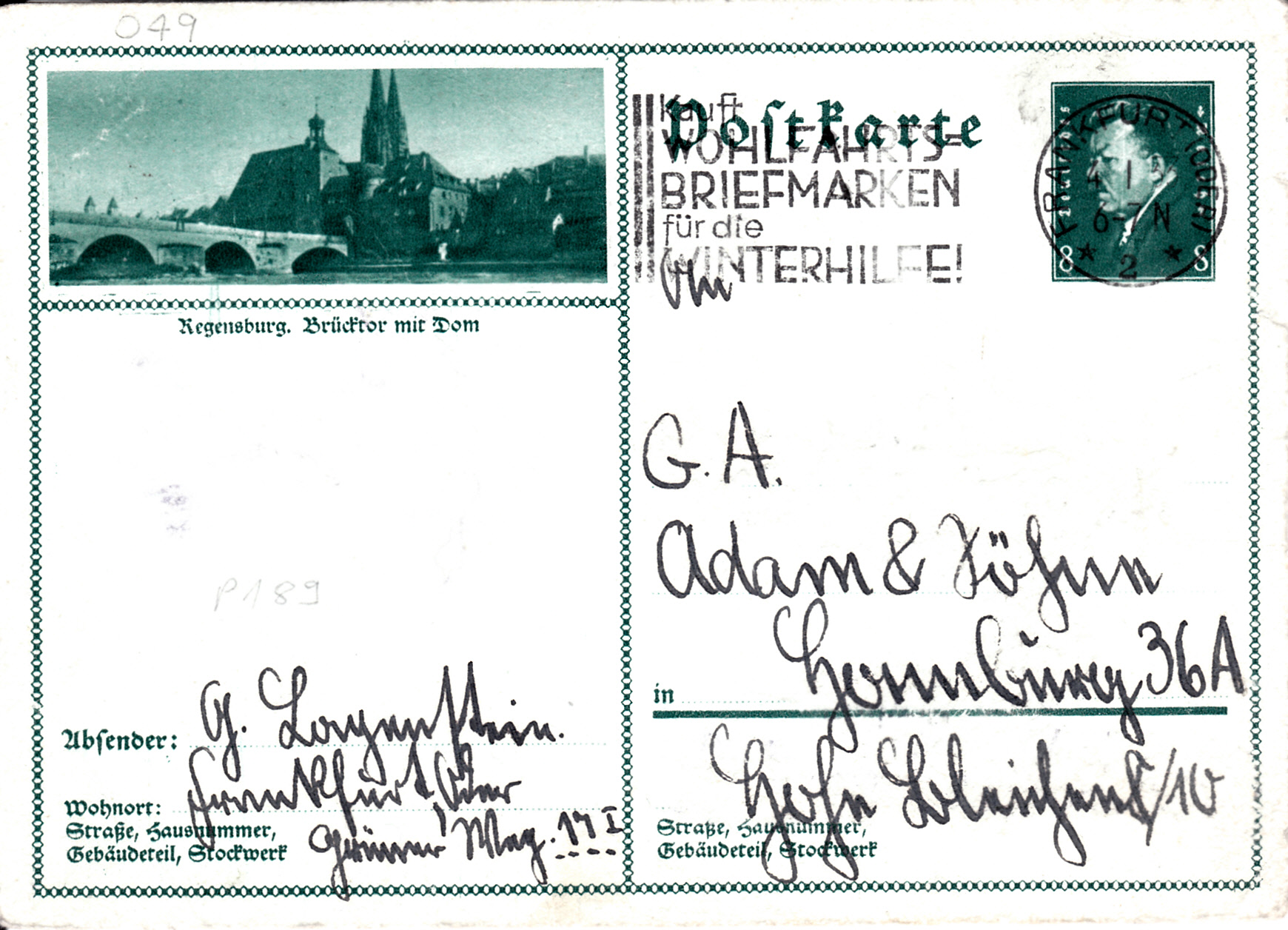 Es folgt die Bildpostkarte (MiNr P 189/49) mit einer Abbildung mit dem Dom aus Regensburg.