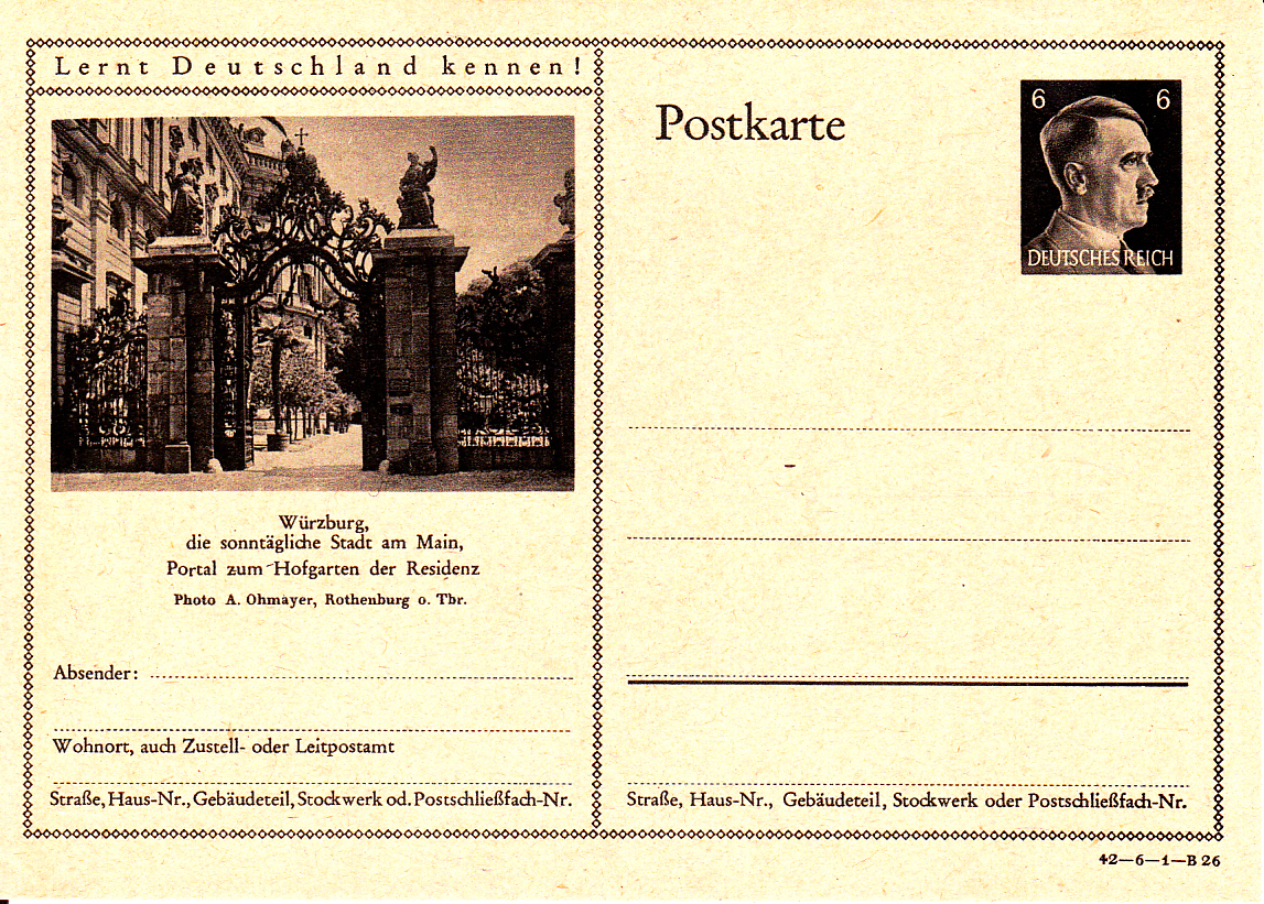 Diese Bildpostkarte (Serie 6 Bild 26) zeigt das Portal zum Hofgarten der Rersidenz. Die Würzburger Residenz ist ein barocker Schlossbau am Rande der Innenstadt von Würzburg, der 1720 begonnen wurde und bis 1744 vollendet war. Die Innenausstattung der in der Schönbornzeit unter der Regie von Balthasar Neumann entstandenen Residenz wurde im Jahr 1781 fertiggestellt.