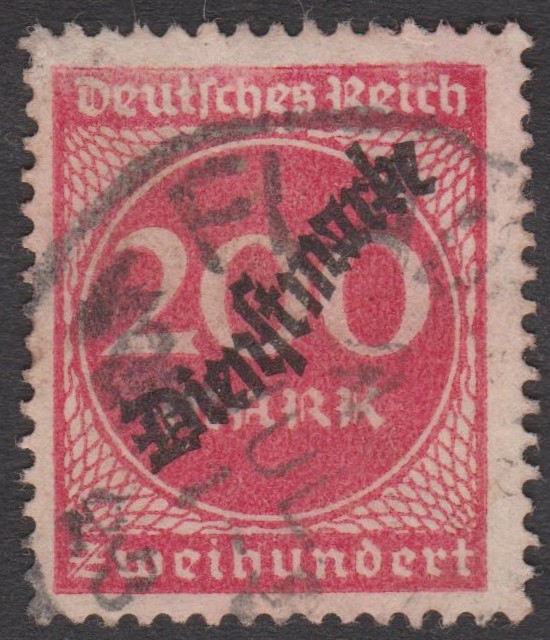 Diese Dienstmarke erschien 1923, indem die Freimarke "Ziffern in Kreis", Deutsches Rech MiNr. 269, mit Wassereichen 2 = "Waffeln", mit einem Aufdruck "Dienstmarke" versehen wurde.