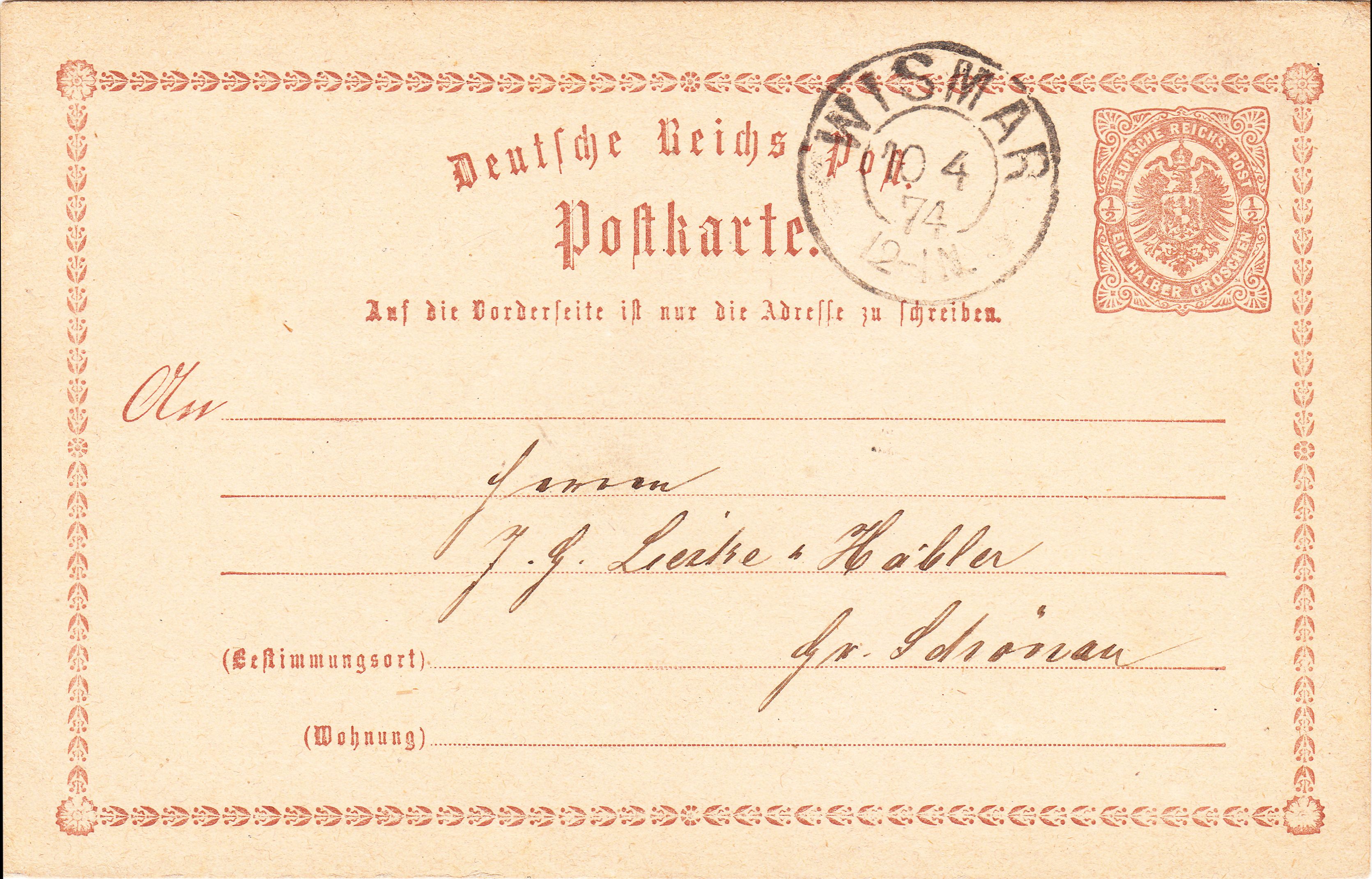 Diese Ganzsache MiNr. P 1 wurde am 10.04.1874 entwertet per Zweikreisstempel WISMAR: