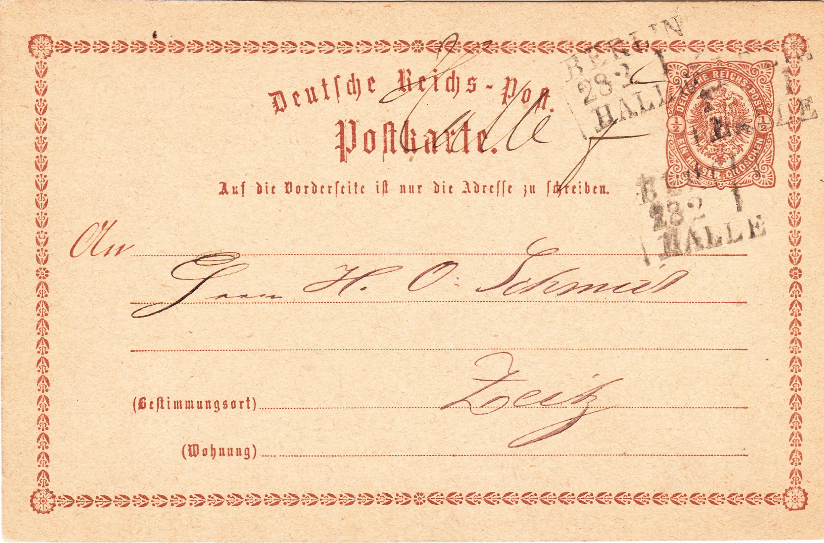 Mit 9.99 € inklusive Porto passte diese Ganzsache MiNr. P 1, entwertet am 05.03.1875, also während der Pfennigzeit, per Kreisstempel BERLIN P.E.12, adressiert nach Halle an der Saale, wo sie einen dreizeiligen Rahmenstempel als Ankunftsstempel erhielt, preislich exakt in unser Beuteschema: