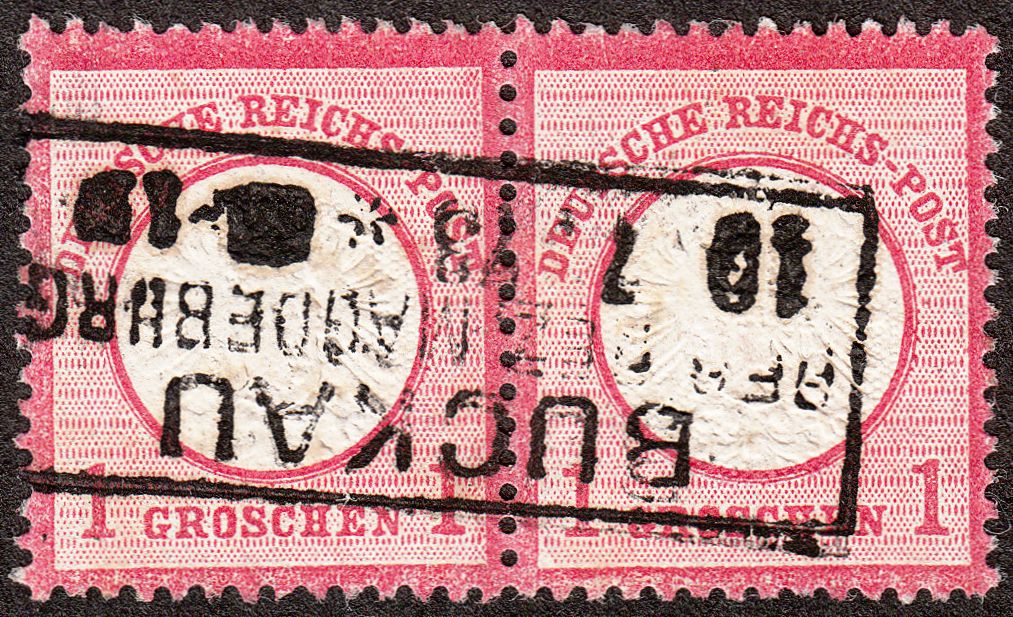 Dieses Paar der MiNr. 19 wurde am 10.07.1873 entwertet per dreizeiligem Rechteckstempel BUCKAU: