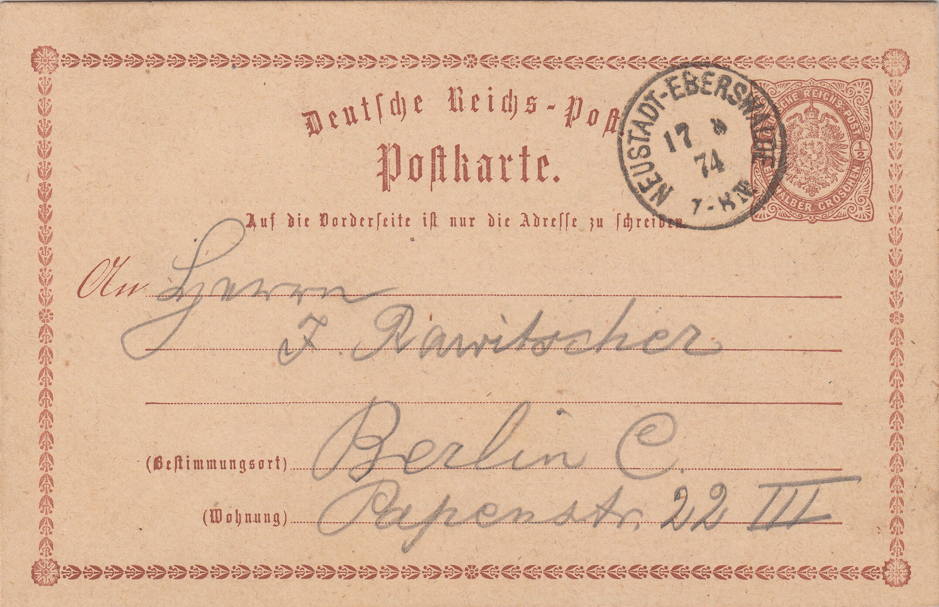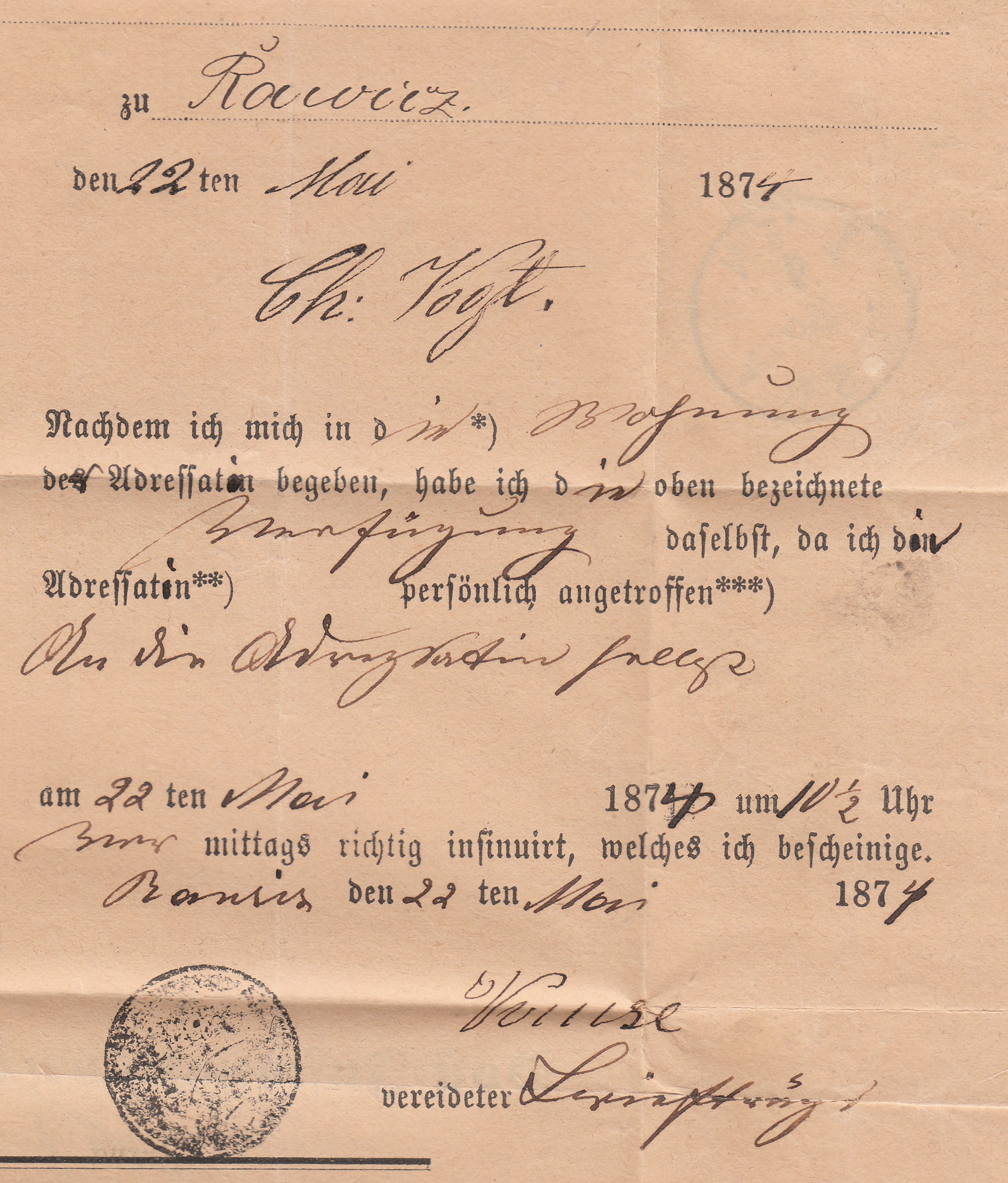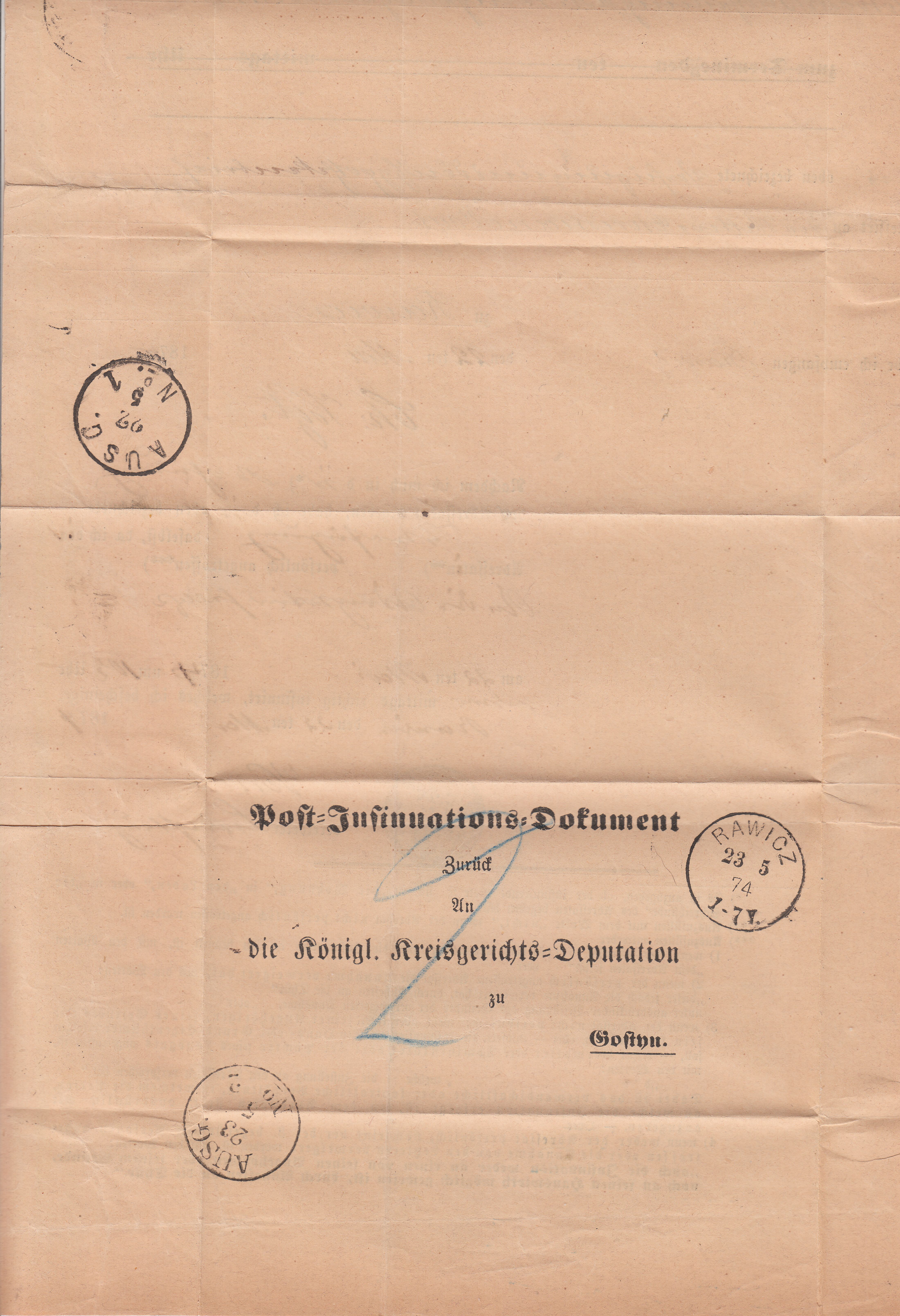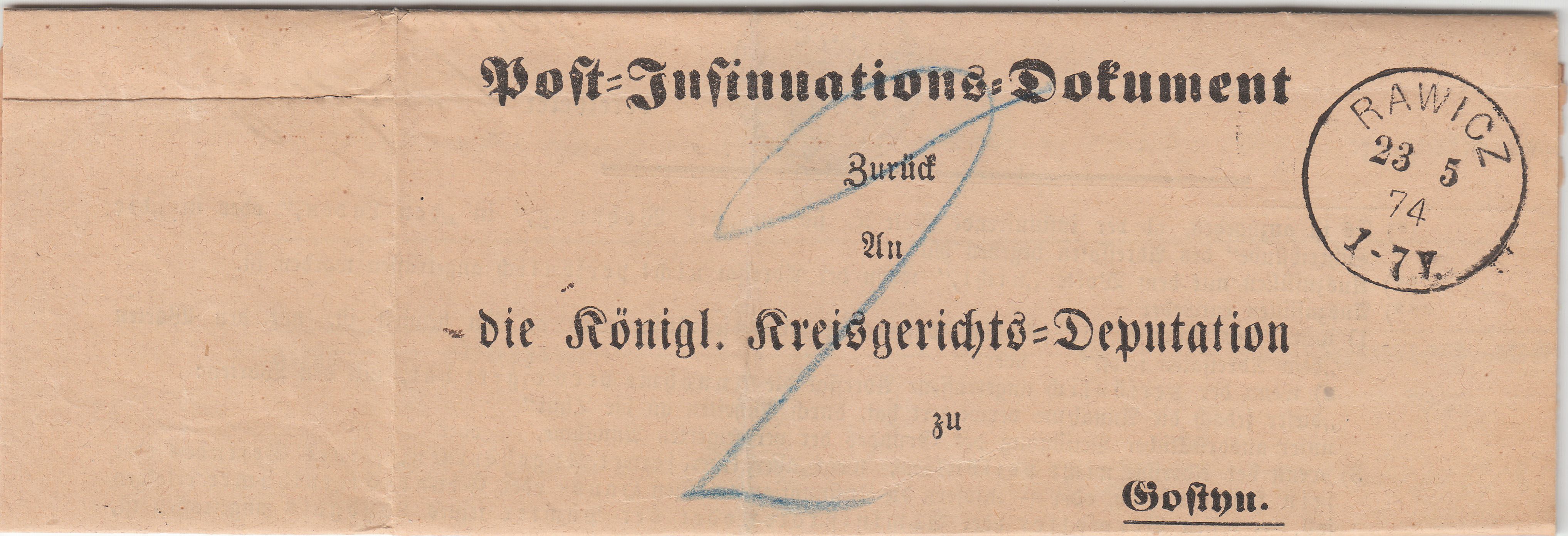 In diesem Angebot bei ebay gab es für 3,05 € inklusive Porto ein Post-Insinuations-Dokument, gelaufen am 23.05.1874 von RAWICZ nach Gostyn: