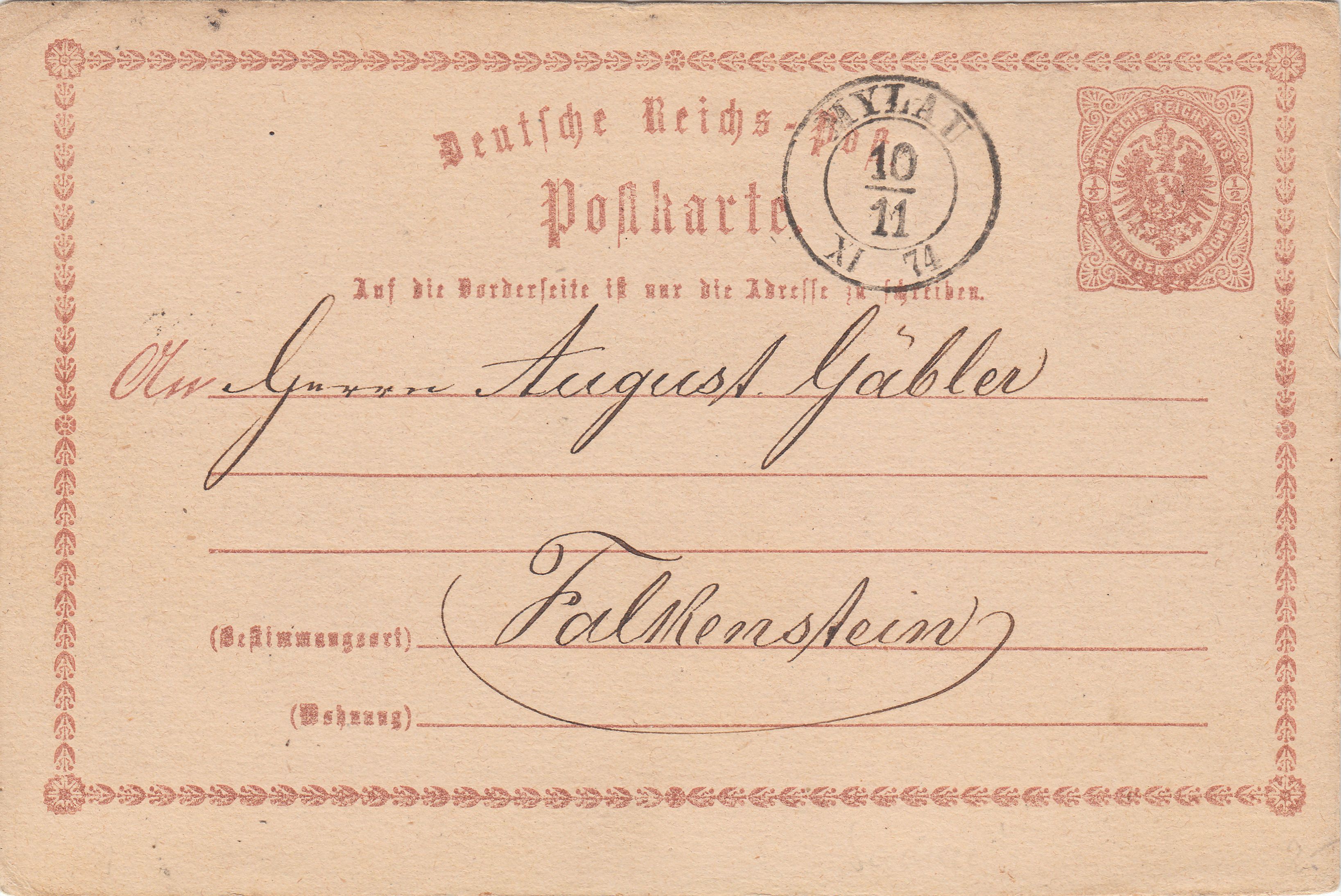 Hier eine Ganzsache MiNr. P1, die am 10.11.1874 per nachverwendetem sächsischem Zweikreisstempel "MYLAU", Feuser SA 210, entwertet wurde: