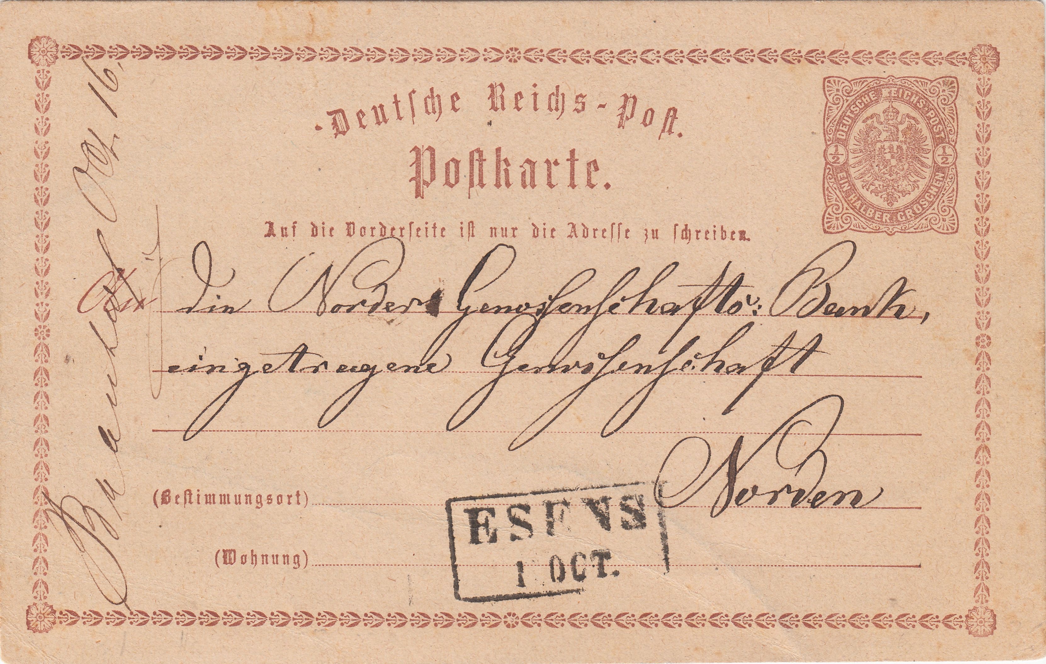 Diese Ganzsache MiNr. P1 wurde am 13.10.1874 per nachverwendetem hannoverschem zweizeiligem Rechteckstempel "ESENS" entwertet, in welchem die "3" des Tagesdatums fehlte: