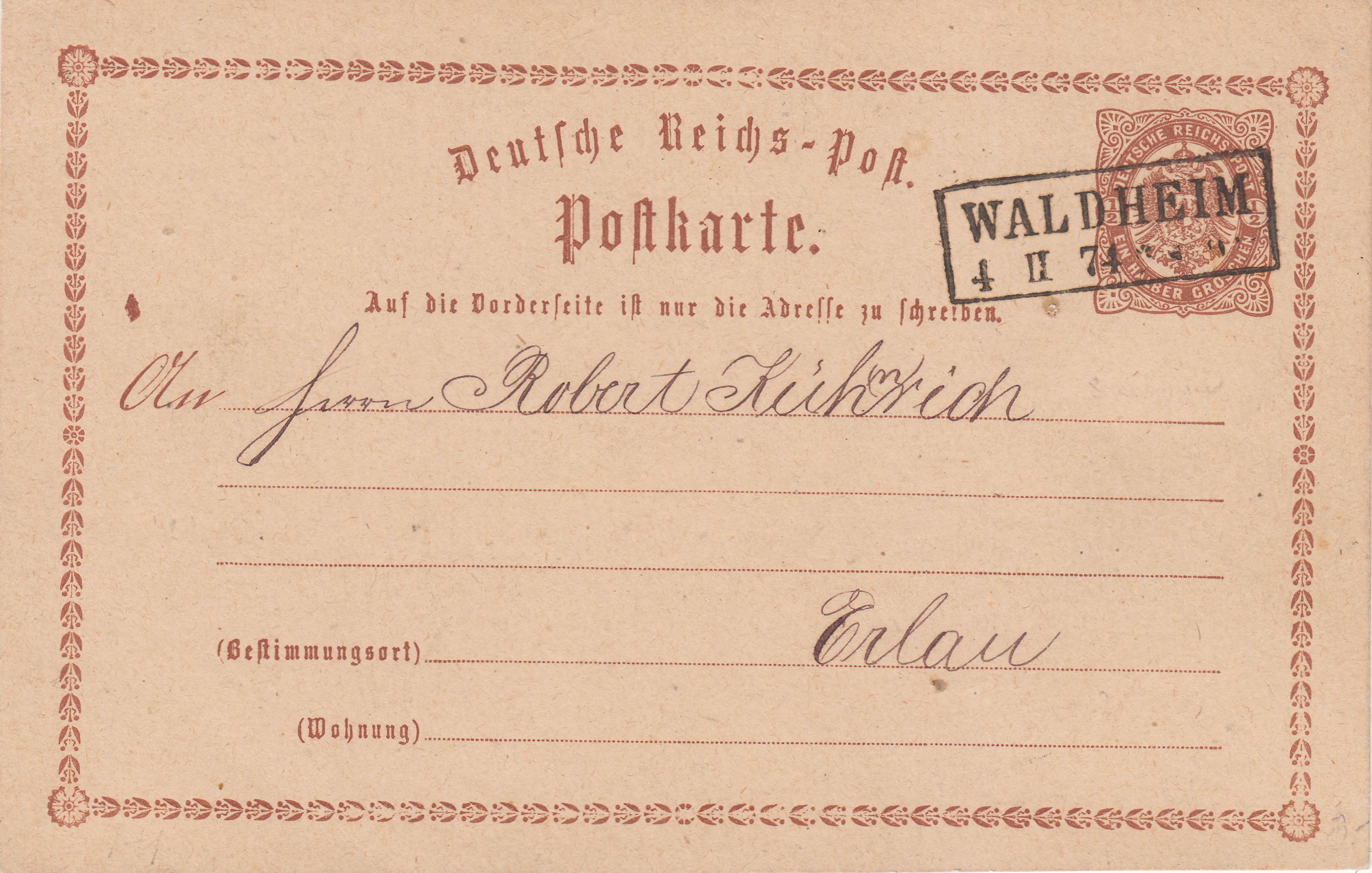 Diese Ganzsache MiNr. P1 wurde am 04.02.1874 per nachverwendetem sächsischem zweizeiligem Rechteckstempel "WALDHEIM", Feuser SA 322, entwertet: