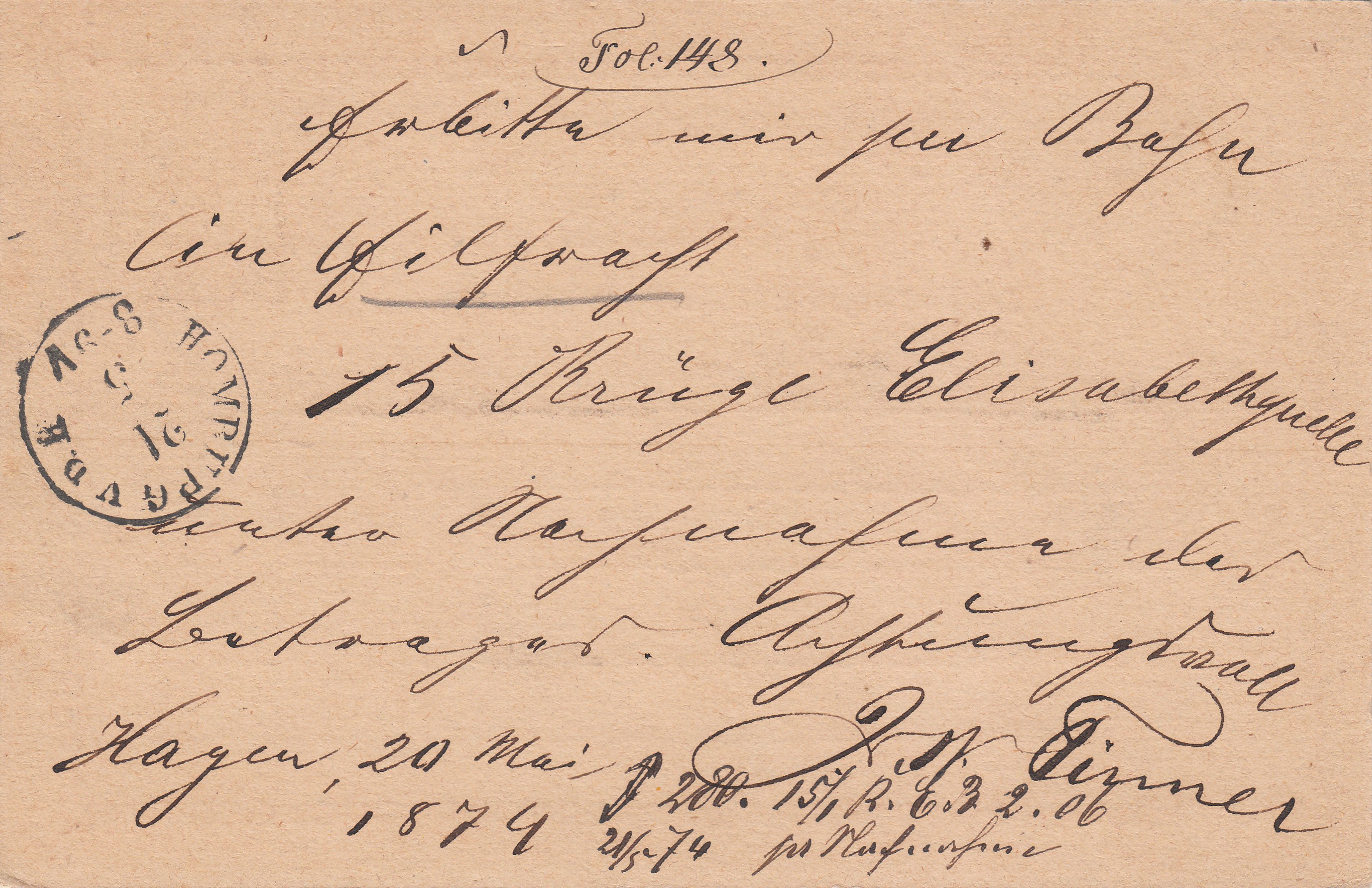 Hier eine Ganzsache MiN. P1, entwertet am 20.05.1874 per nachverwendetem NDP-Kreisstempel "HAGEN i. W. STADT.", Feuser NDP 402: