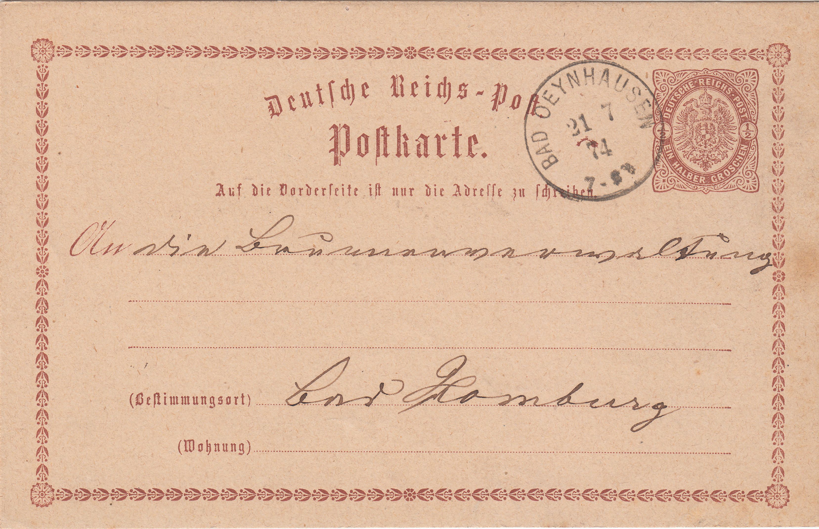 Hier eine Ganzsache MiNr. P1, am 21.07.1874 entwertet per nachverwendetem NDP-Kreisstempel "BAD OEYNHAUSEN", Feuser NDP 036: