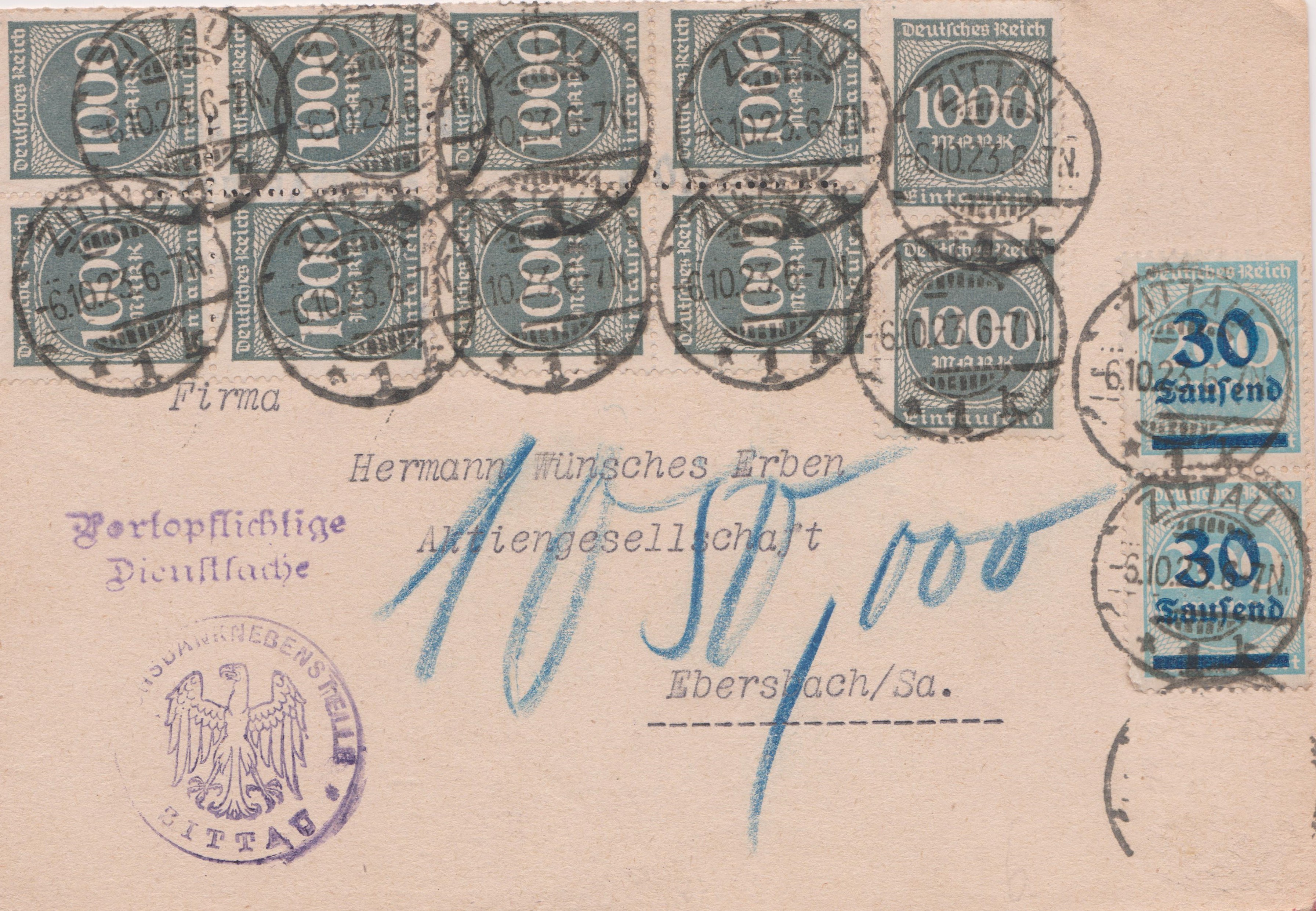 "Portopflichtige Dienstsache" in Kartenform, aufgegeben am 06.10.1923 in ZITTAU, adressiert nach "Eberbach/Sa.":