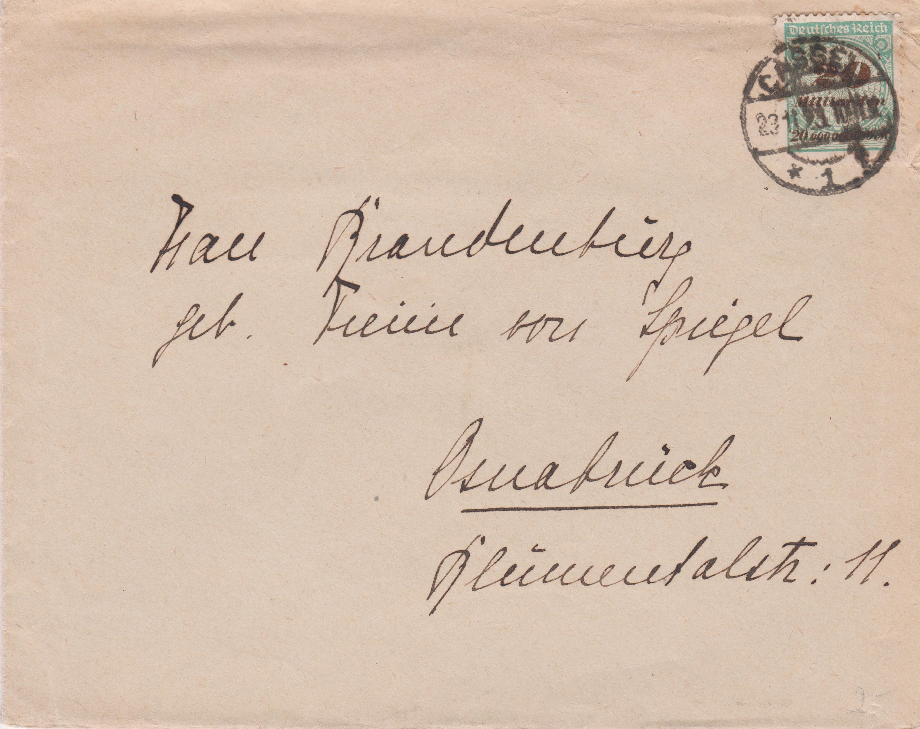 Fernbrief nach Osnabrück, frankiert mit 20 Milliarden Mark per Einzelfrankatur aufgegeben am 23.11.1923 in CASSEL:
