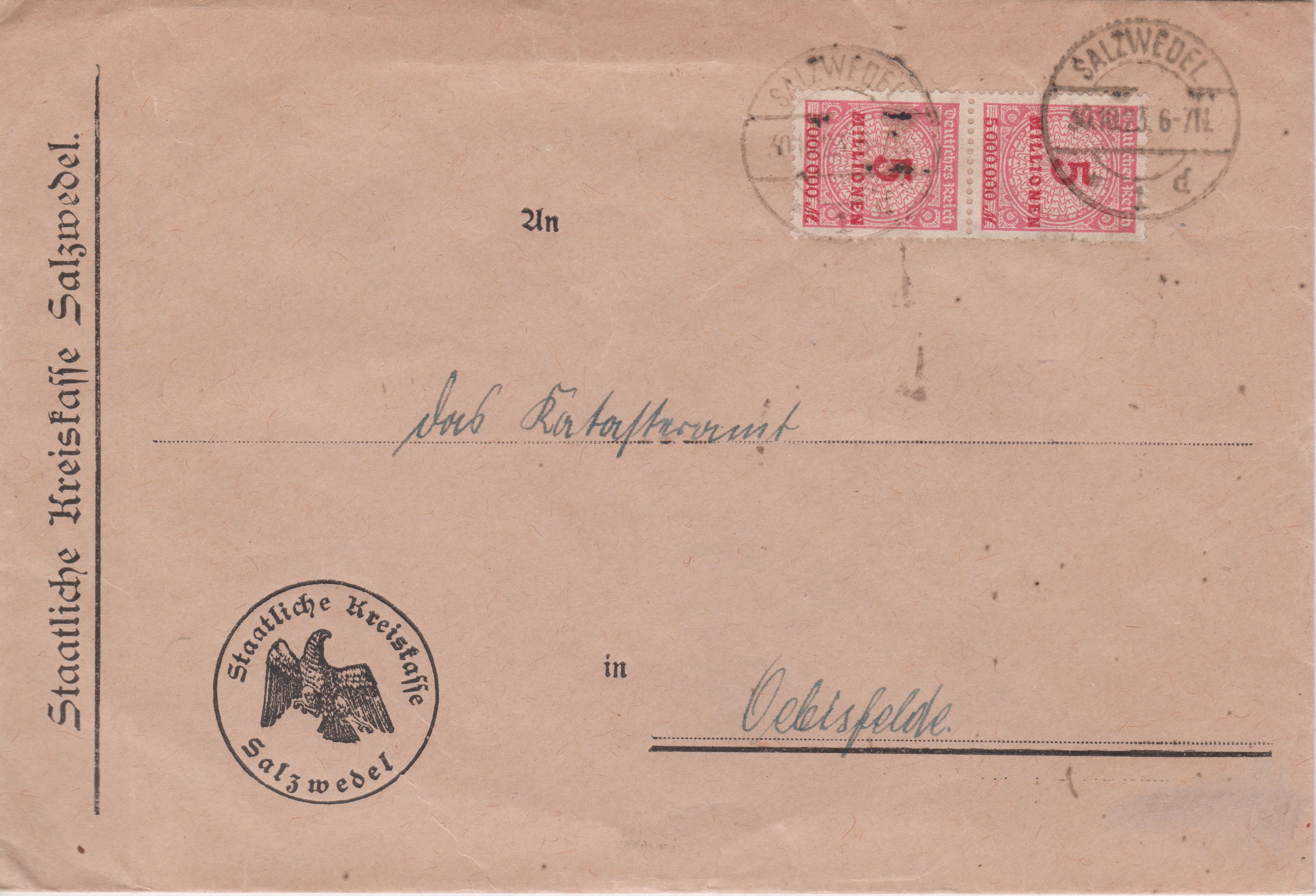 Brief im Fernverkehr von SALZWEDEL nach Oebisfelde, am 30.10.1923 portogerecht frankiert mit 10 Millionen Mark per Mehrfachfrankatur 2 x 5 MILLIONEN: