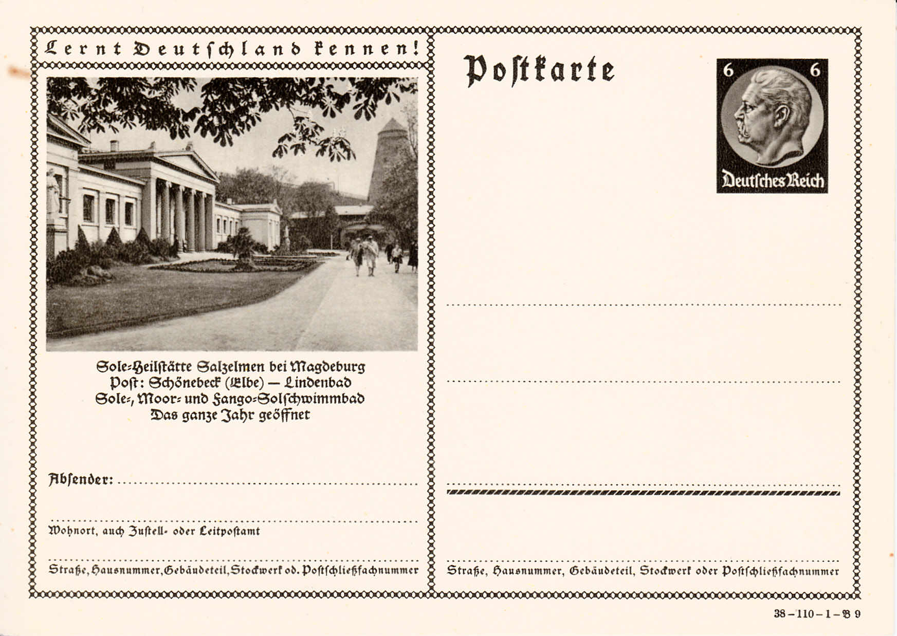 Bad Salzelmen, seit 1932 ein Stadtteil von Schönebeck (Elbe), bildet auf einer Karte (Serie 110 Bild 9) sein Kurmittelhaus "Lindenbad" ab.