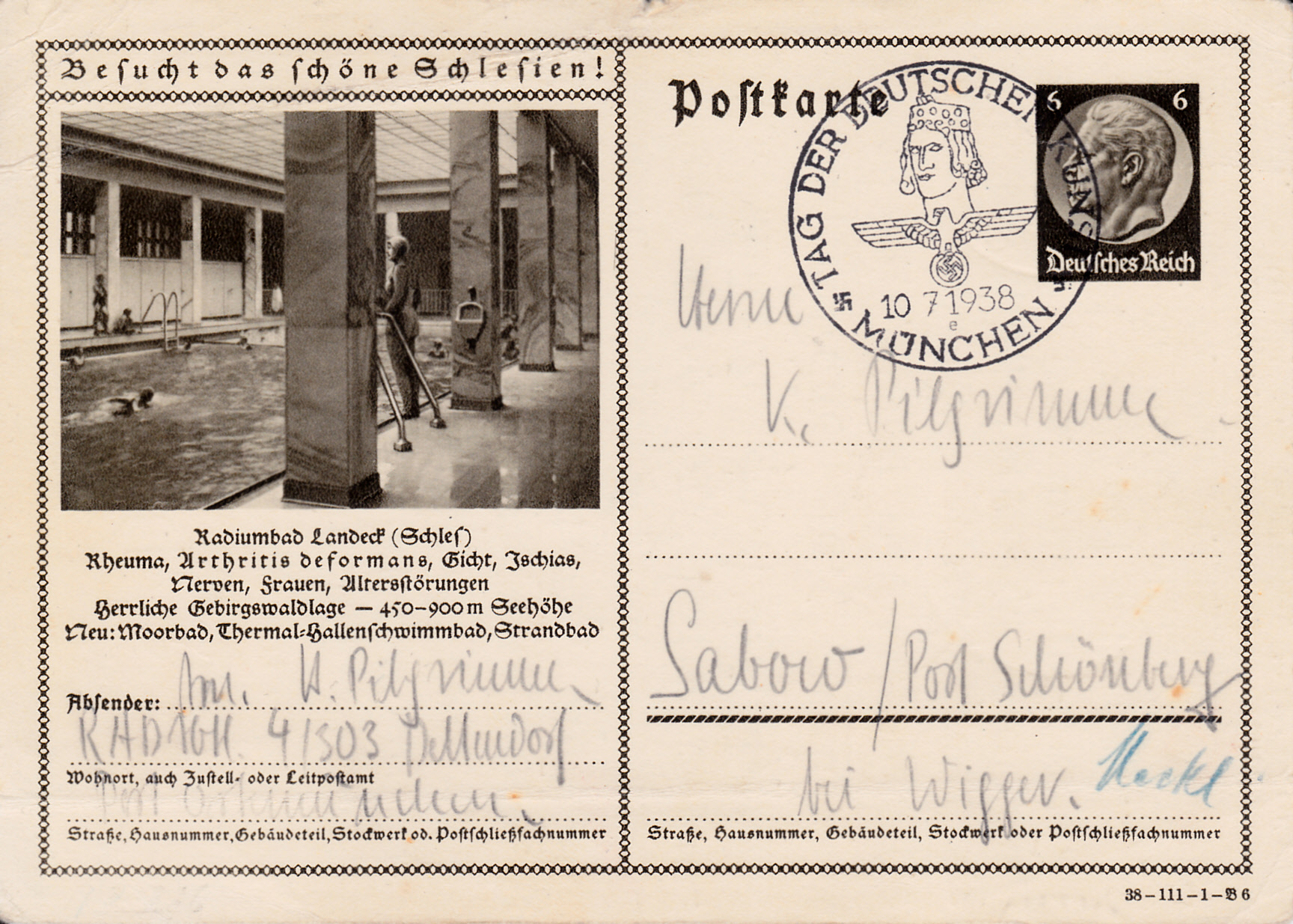 Das Radiumbad Landeck (Schlesien) wiederholt auf dieser Karte (Serie 111 Bild 6) ein Foto einer Karte aus dem Jahre 1937 aus dem Thermal-Hallenschwimmbad.