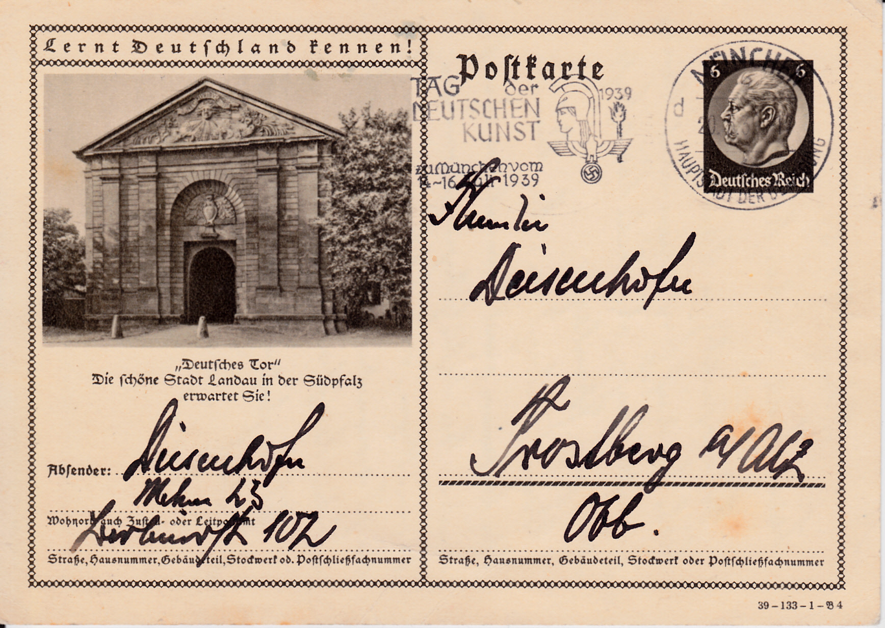 Heidelberg verwendet auf den Karten 1938 wieder das gleiche Foto mit dem Heidelberger Schloss wie in den Vorjahren. Hier zeige ich die Karte mit dem Druckvermerk "1939-134-1-B3" also Serie 134 Bild 3. Es werden auch wieder die Aufführungen bei den Reichsfestspiele 1939 Heidelberg beworben.