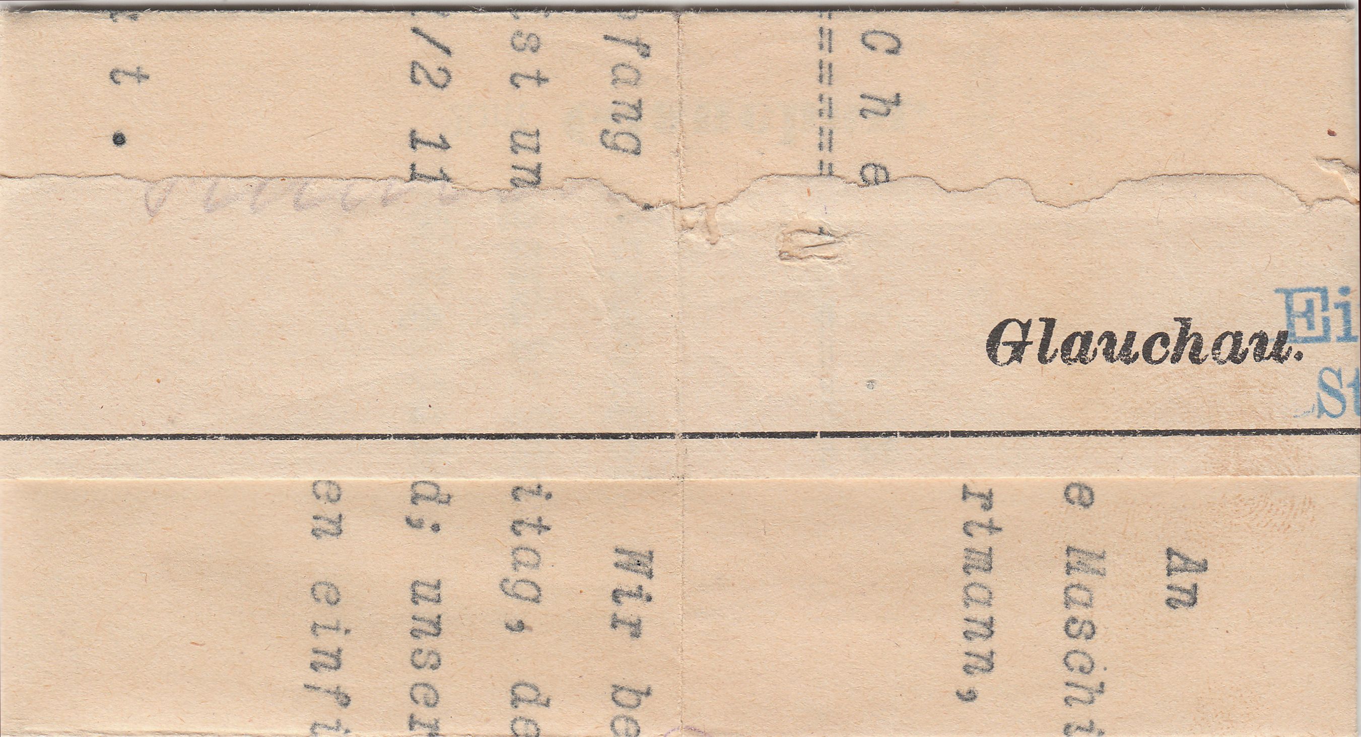Die über dem vorgedruckten "Glauchau" vermerkte Adresse wurde abgetrennt.