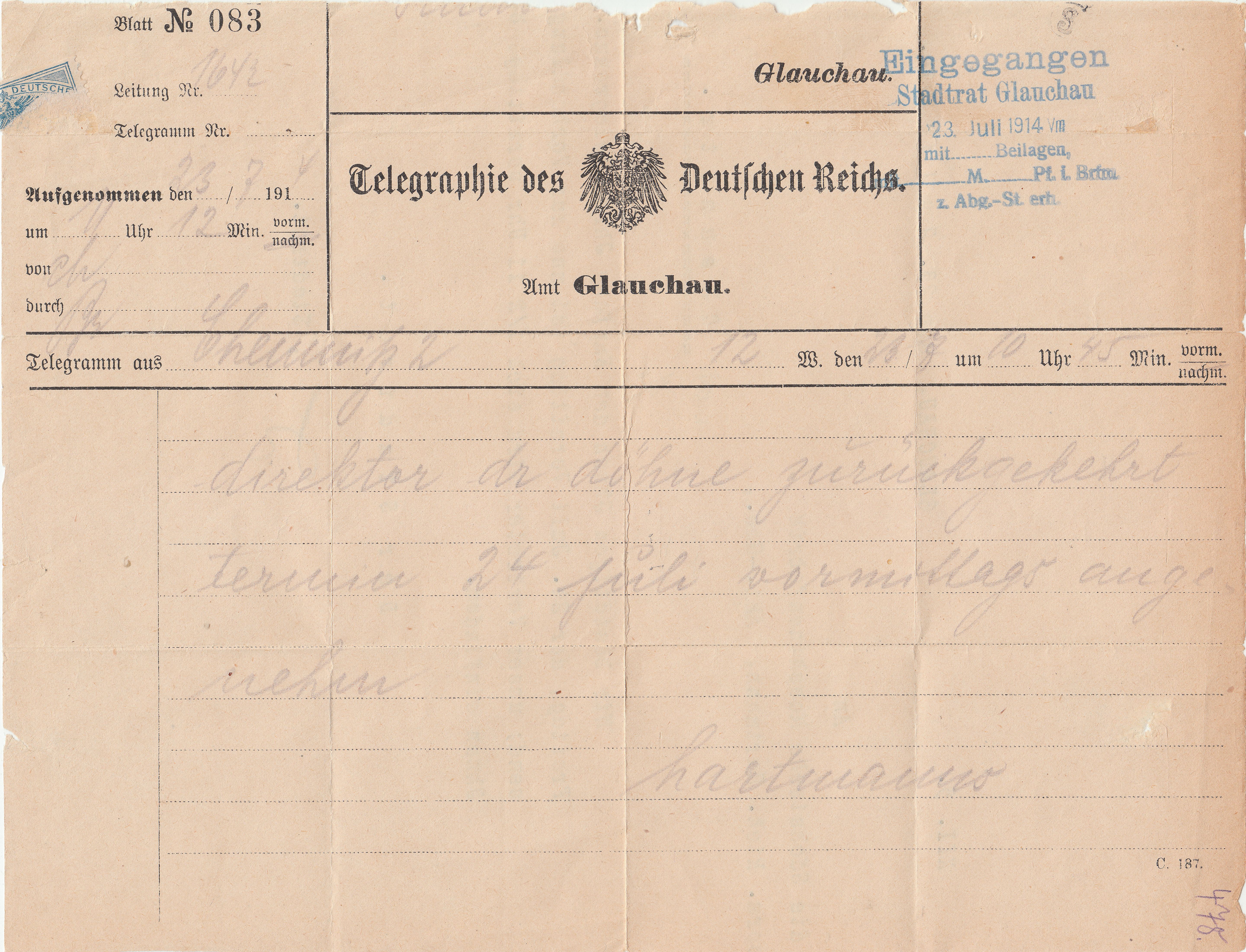 Faltet man das Formular auf, dann kommt ein Vordruck zum Vorschein, der am 23.07.1914 vom Empfänger dieses Telegrammes mit einem Eingangsstempel "Stadtrat Glauchau" versehen wurde: