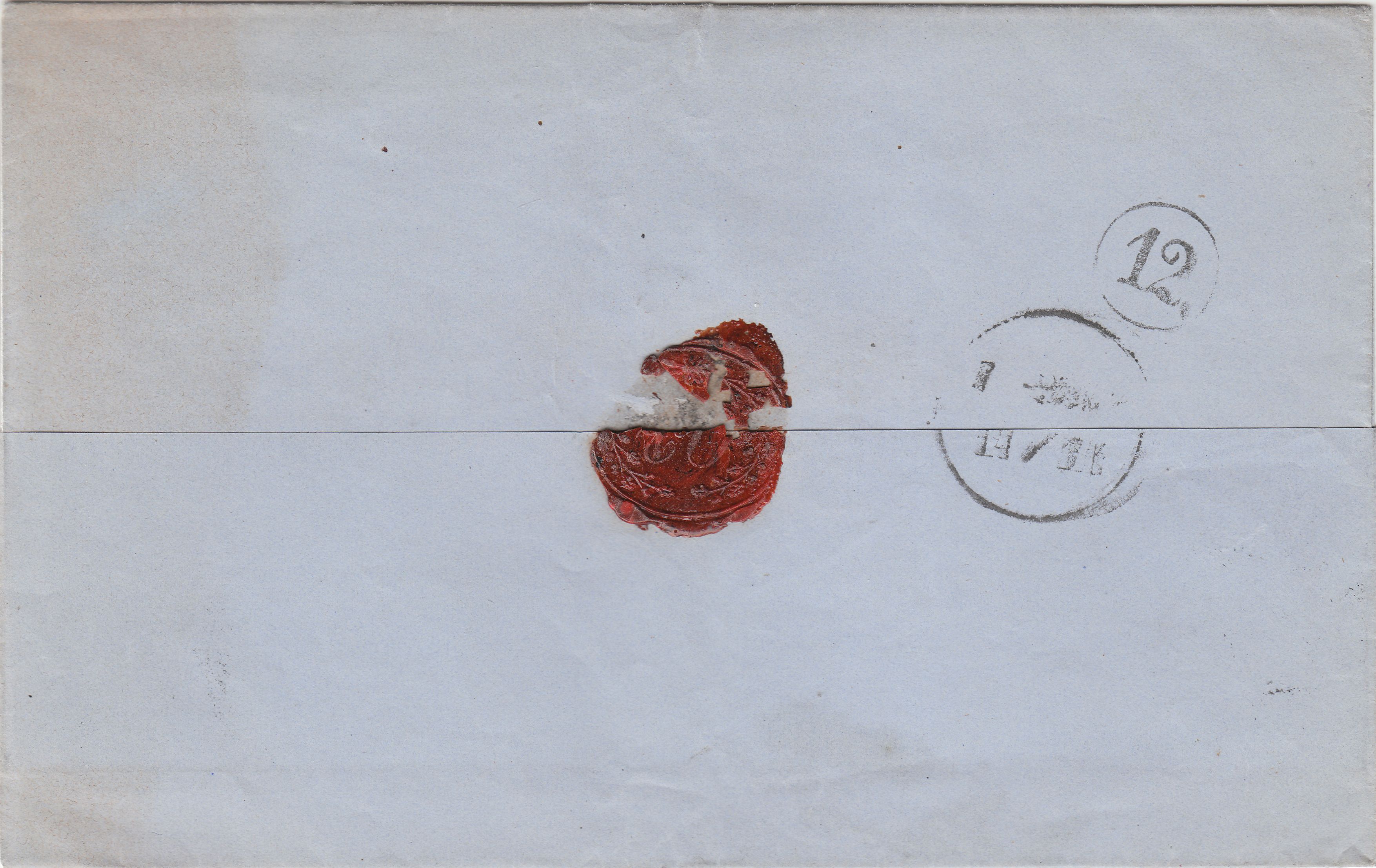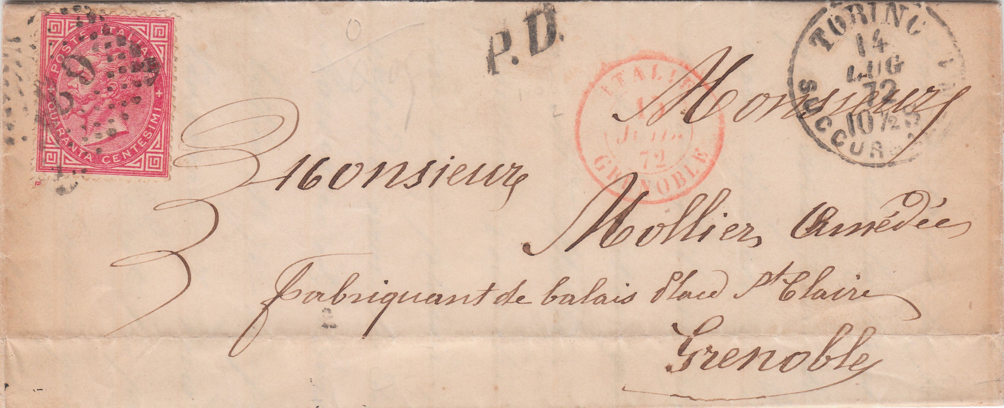 Hier ein nach Grenoble in Frankreich adressierter Brief, aufgegeben am 14.07.1872 in Turin: