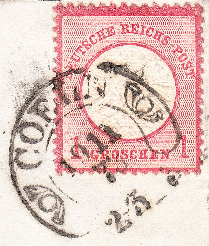 Hier ein Briefstück der MiNr. 19, entwertet am 19.11.1873 per Hufeisenstempel COELN mit Posthörnchen als Zierstücken: