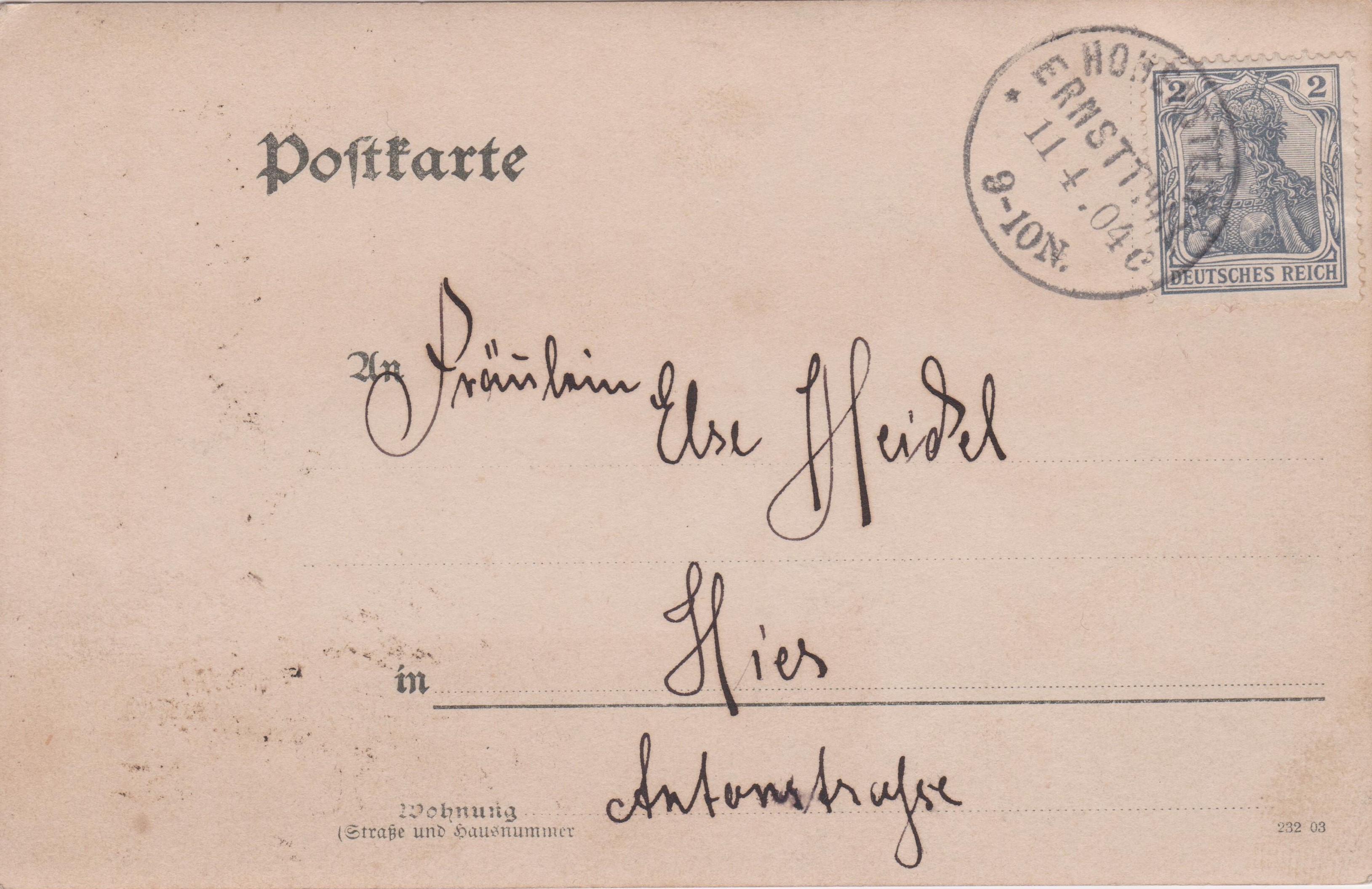 Postkarte im Ortsverkehr, Portostufe 2 Pfennig, am 11.04.1904 portogerecht freigemacht per Einzelfrankatur Deutsches Reich MiNr. 68, entwertet mit Einkreisstempel "HOHENSTEIN ERNSTTHAL":