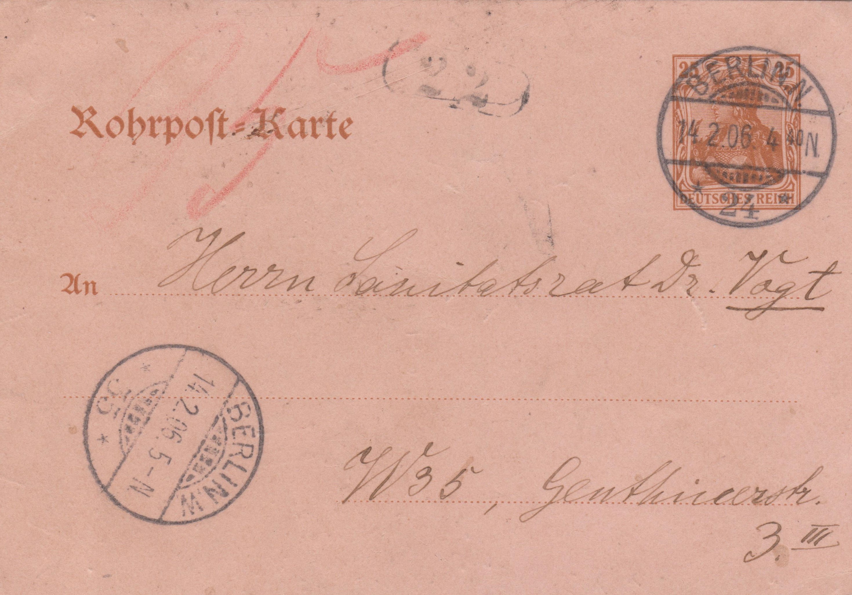 Bei dem Aufgabestempel in BERLIN N 24, der der Entwertung des in die Rohrpost-Karte eingedruckten Postwertzeichens diente, wurde eine Zeiteinstellung mit Minutenangabe benutzt, die bei diesem Beispiel auf "4 40 N", also 16 Uhr 40, eingestellt war. In BERLIN W 35 wurde ein Eingangsstempel am 14.02.1906 um "5 N" = 17 Uhr abgeschlagen. Dann wurde diese Rohrpost-Karte dem Empfänger in Berlin W 35 durch den Zusteller "22" unverzüglich zugestellt.