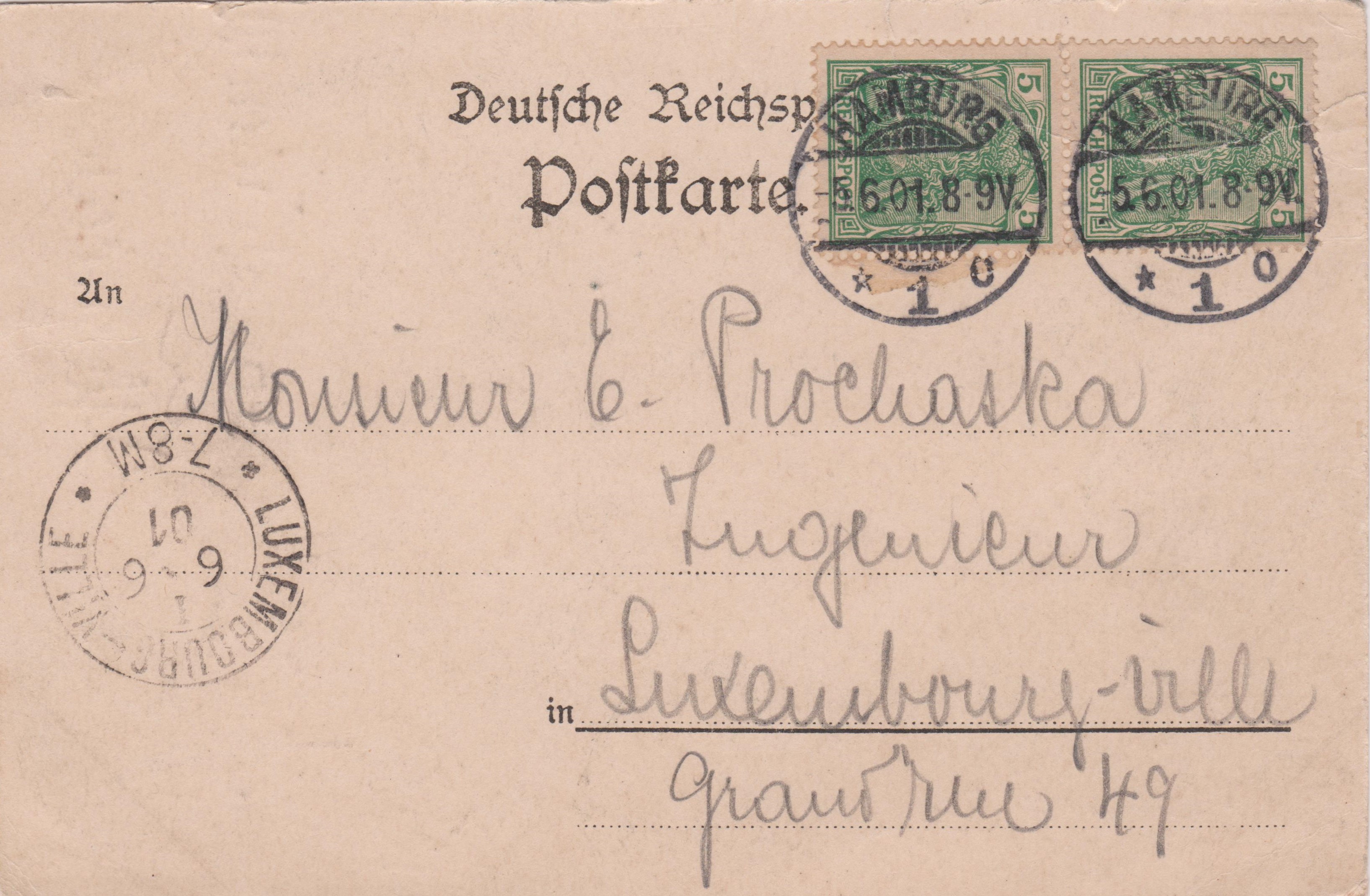 Postkarte nach Luxemburg, am 05.06.1901 in HAMBURG 1 freigemacht per Mehrfachfrankatur mit einem Zweierstreifen 5 Pf REICHSPOST, Deutsches Reich MiNr. 55: