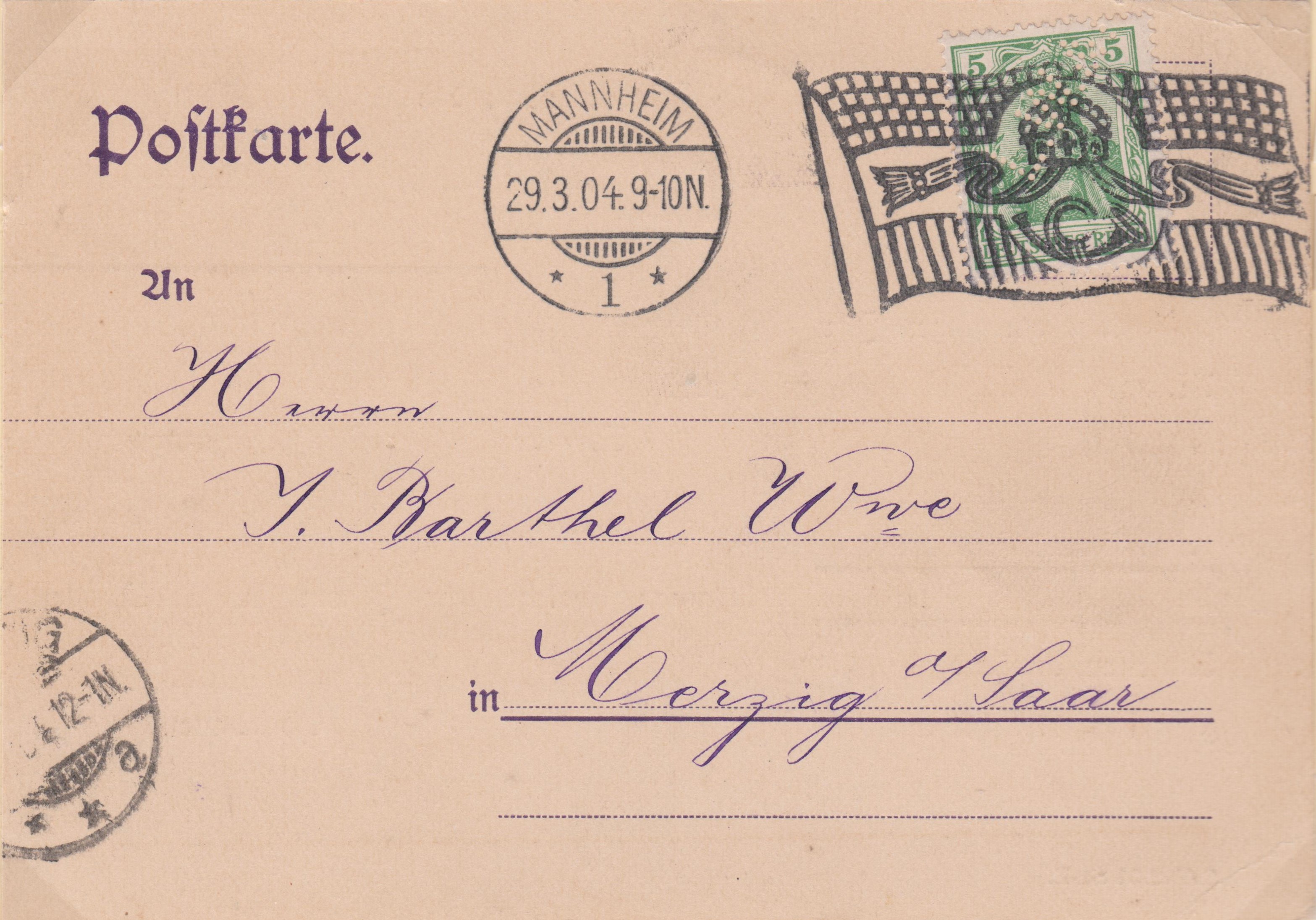 Eine Postkarte im Fernverkehr entsprach der Portostufe 5 Pf, hier dargestellt als Einzelfrankatur am 29.03.1904 von Mannheim nach Merzig an der Saar: