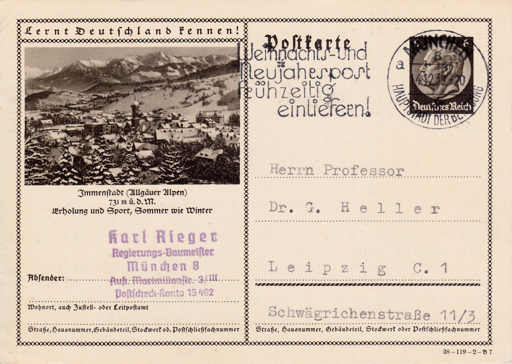 Maschinenwerbestempel "München 8 Hauptstadt der Bewegung" Kennbuchstabe "a" vom 14.12.1938 mit dem Werbeeinsatz "Weihnachts- und Neujahrspost frühzeitig einliefern" auf einer Bildpostkarte.