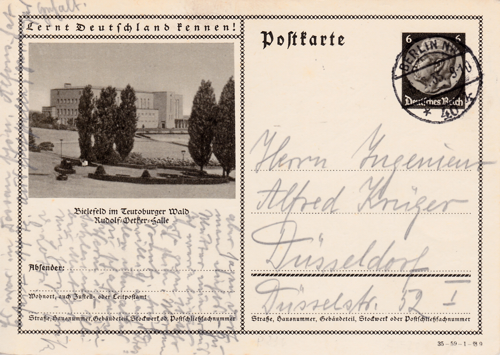 Auch die Karte zur Leipziger Herbstmesse 1935 mit dem Bild aus einem Messehaus gibt es mit einem anderen Druckvermerk (Serie 60 Bild 5).