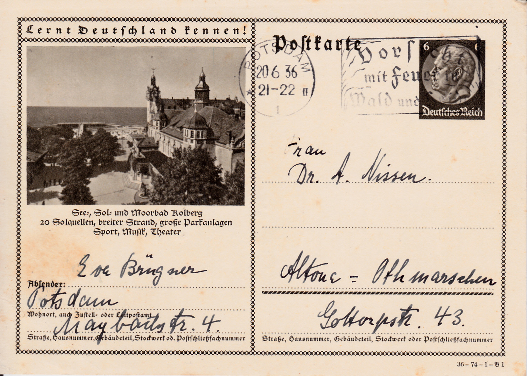 Kolberg (heute Kołobrzeg) zeigte 1936 auf dieser Karte (Serie 74 Bild 1) ein weiteres Foto mit dem Strandschloss (Kurhaus).